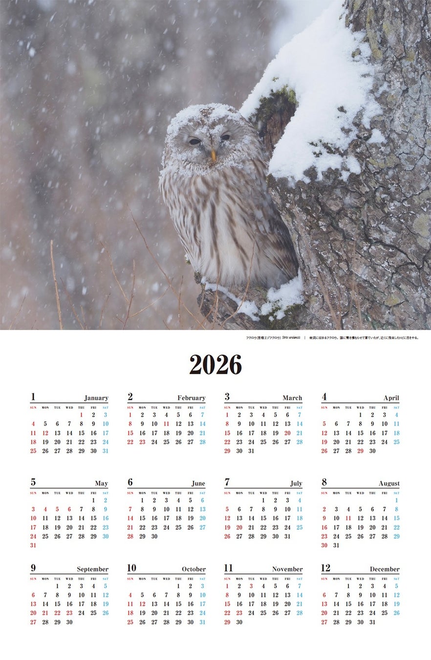 最終ページは2026年の年間カレンダーと亜種エゾフクロウです。