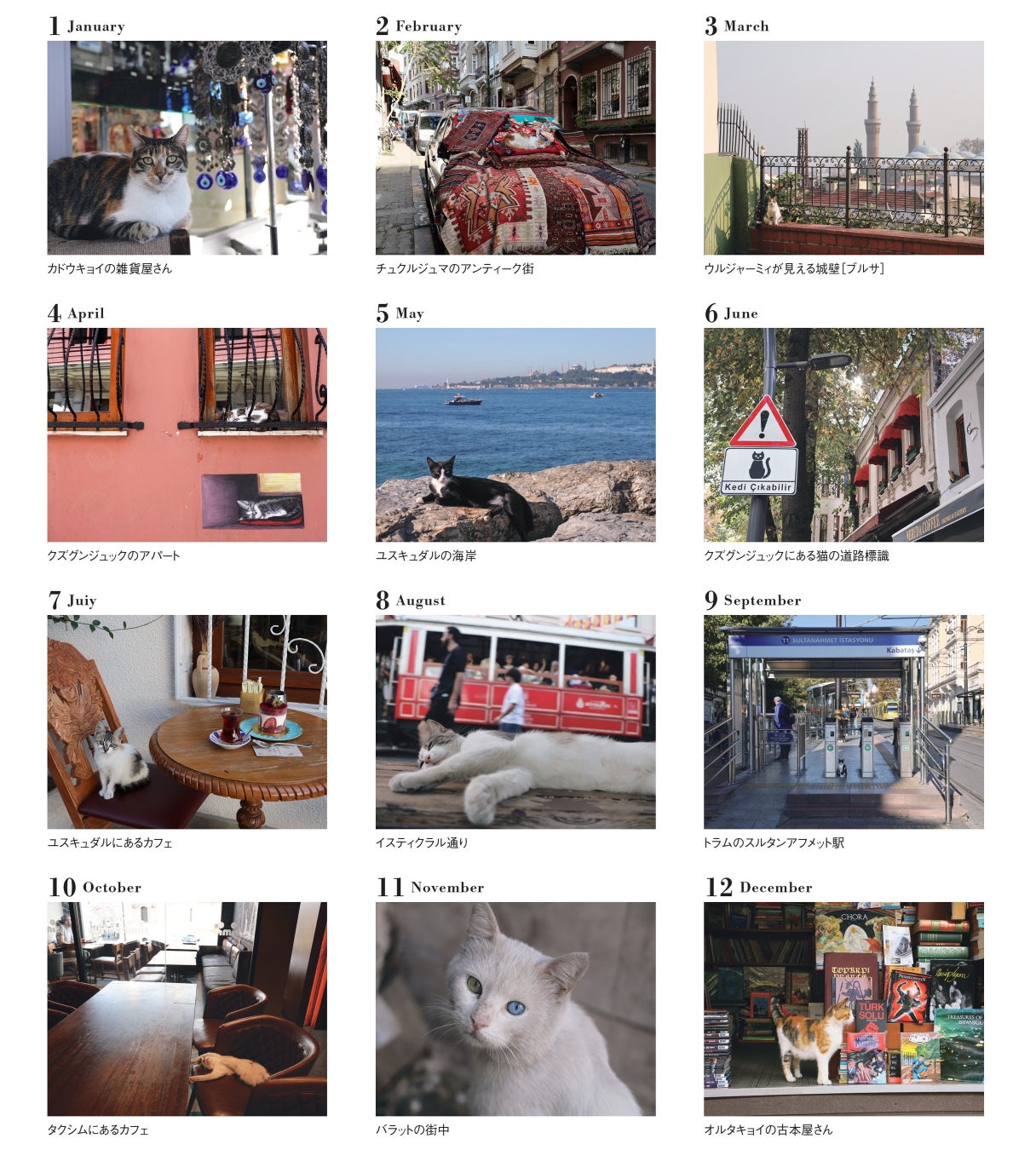 街にとけこむねこたちの表情を楽しみながら、異国感あふれるトルコの風景に旅気分も味わえるカレンダーです。