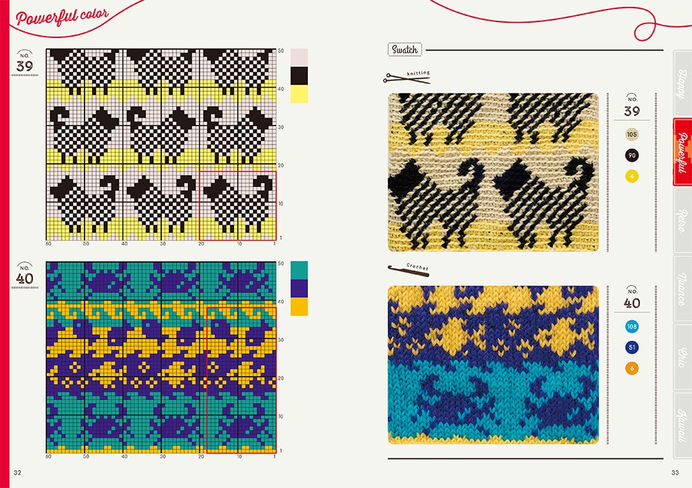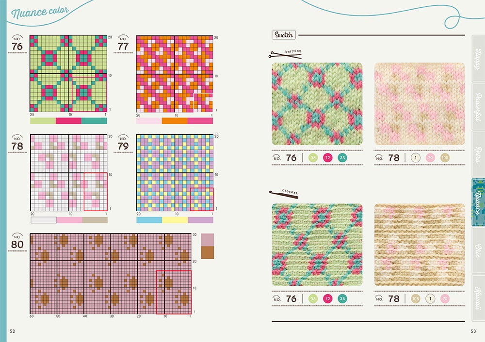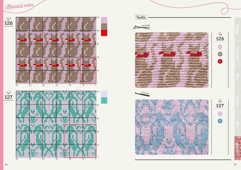 特徴のひとつが同じ図案でかぎ針編みと棒針編みのスワッチを載せていること。