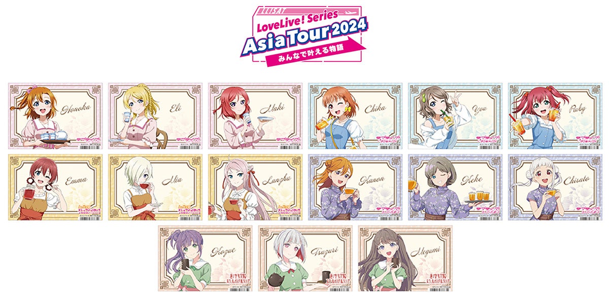 全国アニメイト・アニメイト通販で1月25日~2月24日まで開催する【「LoveLive! Series Asia Tour2024 ~みんなで叶える物語~」開催記念フェア in アニメイト】では、『ラブライブ!シリーズ』関連のグッズをご購入・ご予約内金1,100円(税込)毎、または書籍・CD・Blu-ray・DVDをご購入・ご予約(内金1,100円〈税込〉以上必須)1点毎に、特典「ブロマイド(全15種)」を1枚プレゼントいたします。特典の絵柄は、各グループのうち3名ずつのメンバーが、ツアー開催地でティータイムを楽しむ様子をイメージした描き下ろしです。