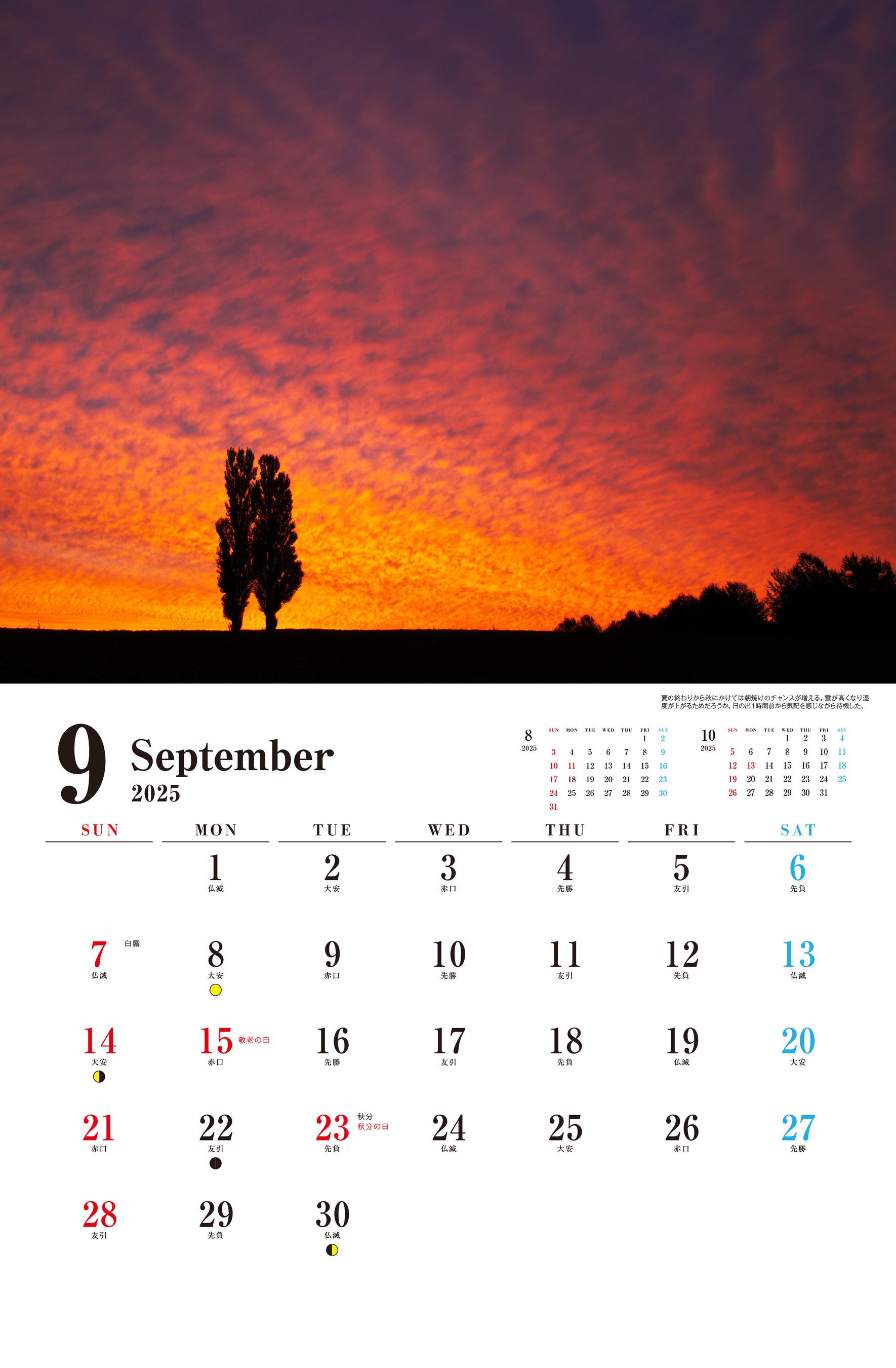 製品の仕様は、月めくりの壁掛けタイプ。上部に作品画像、下部にカレンダー部分で構成しています。六曜、二十四節気、月の満ち欠けも掲載しています。
