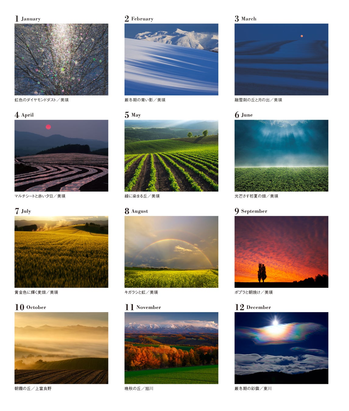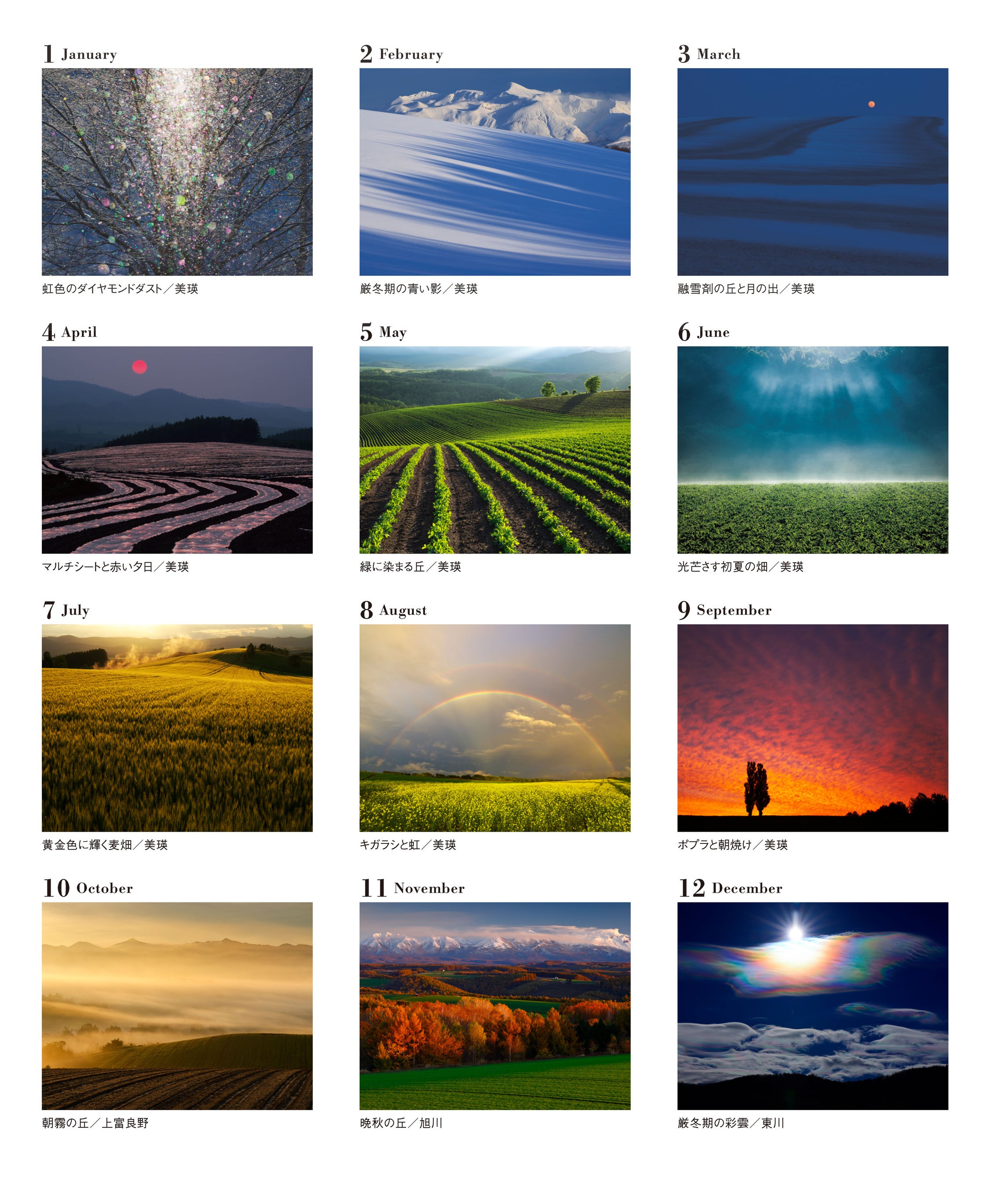 北海道を撮り続けて30年以上、現在は美瑛・富良野を拠点として活躍する風景写真家・中西敏貴氏のカレンダーです。季節の変化を敏感に感じとり、その土地の最も美しい表情をとらえた作品12点をあつめました。繊細かつダイナミックな、北の大地の美しさをご堪能ください。