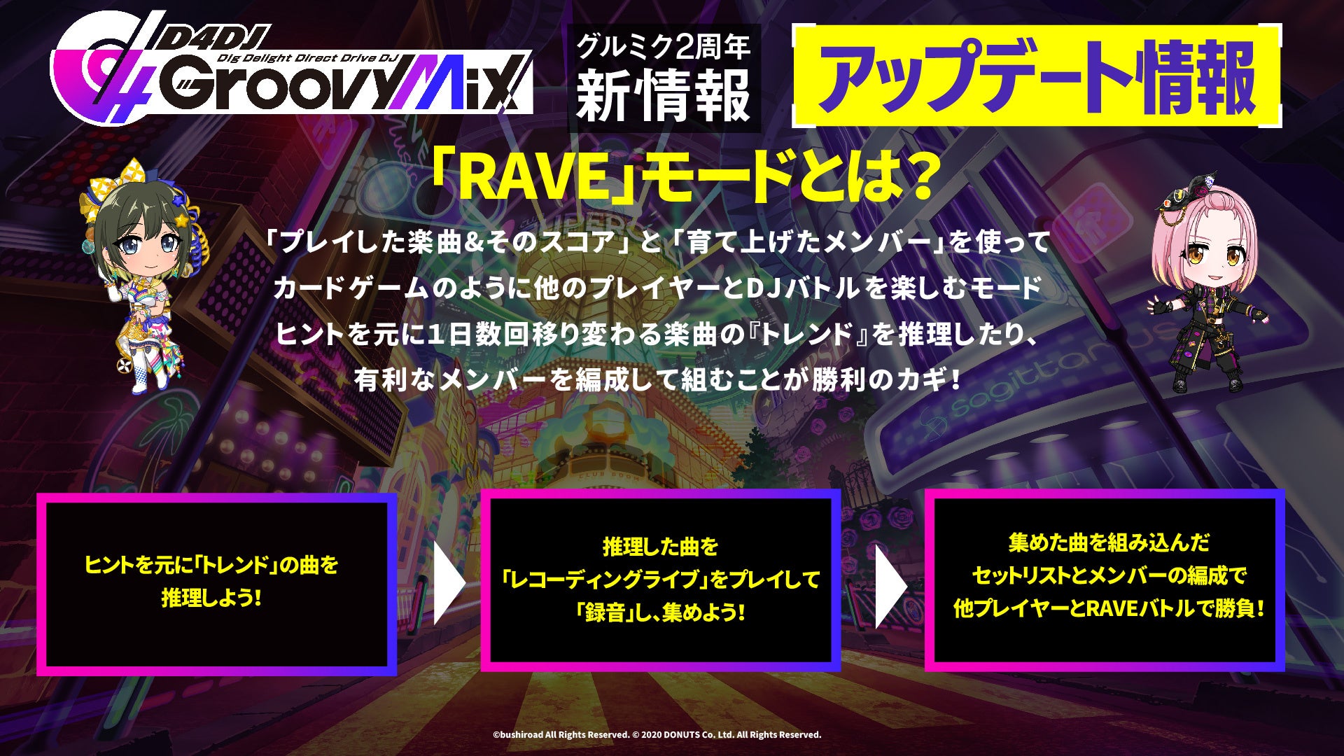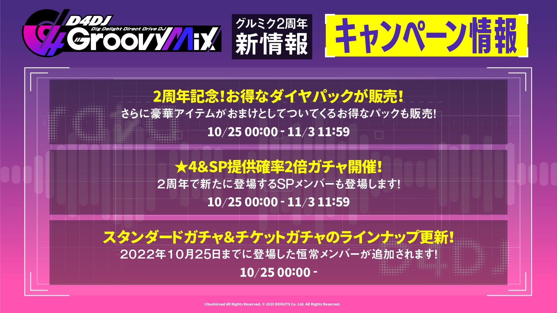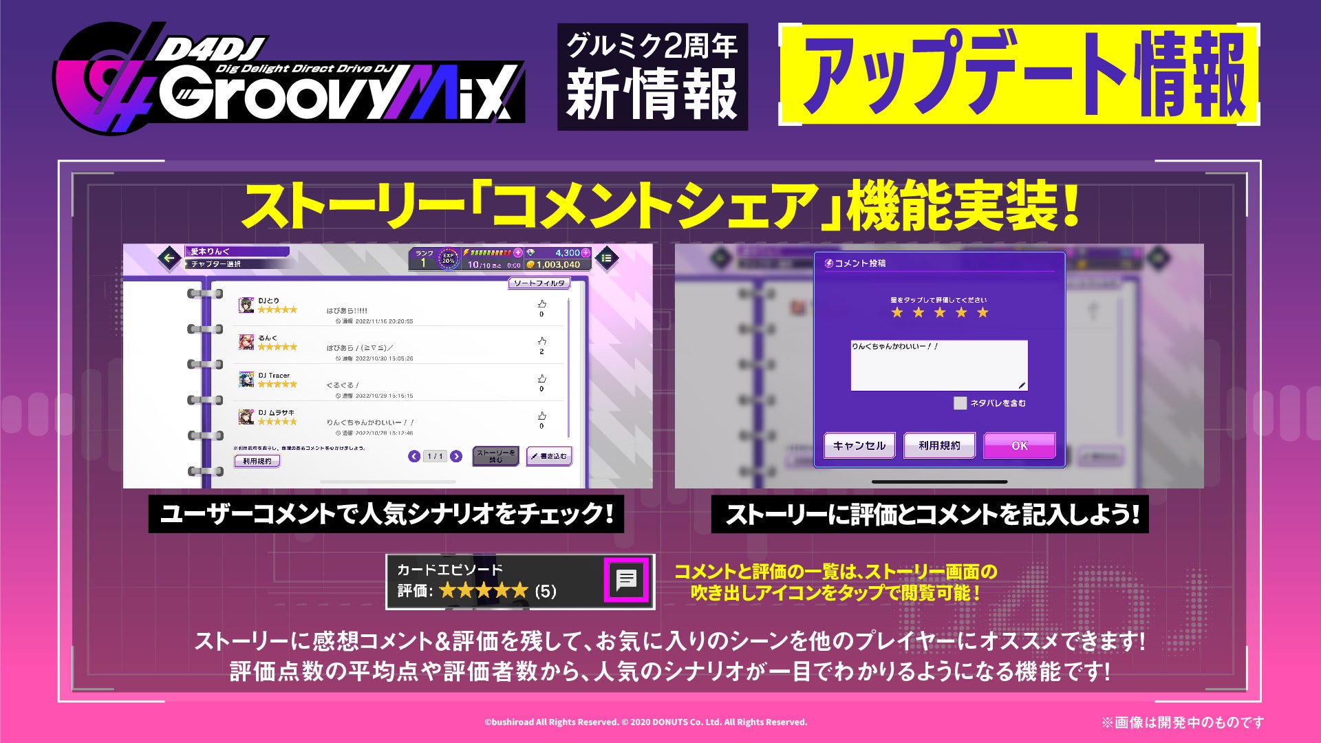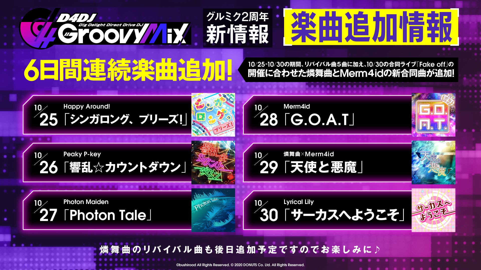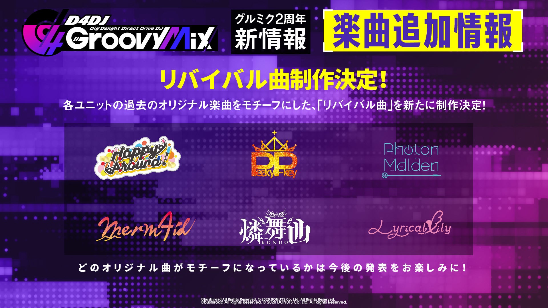 株式会社ブシロード(本社:東京都中野区、代表取締役社長:木谷高明)は、株式会社DONUTS(本社:東京都渋谷区、代表取締役:西村啓成)と共同開発のスマートフォン向けリズムゲーム「D4DJ Groovy Mix」(以下グルミク)の2周年を記念して「グルミク2周年記念生放送」を実施し、新衣装カードの実装や新ユニット「Abyssmare」の登場など各種アップデートの情報を解禁いたしました。