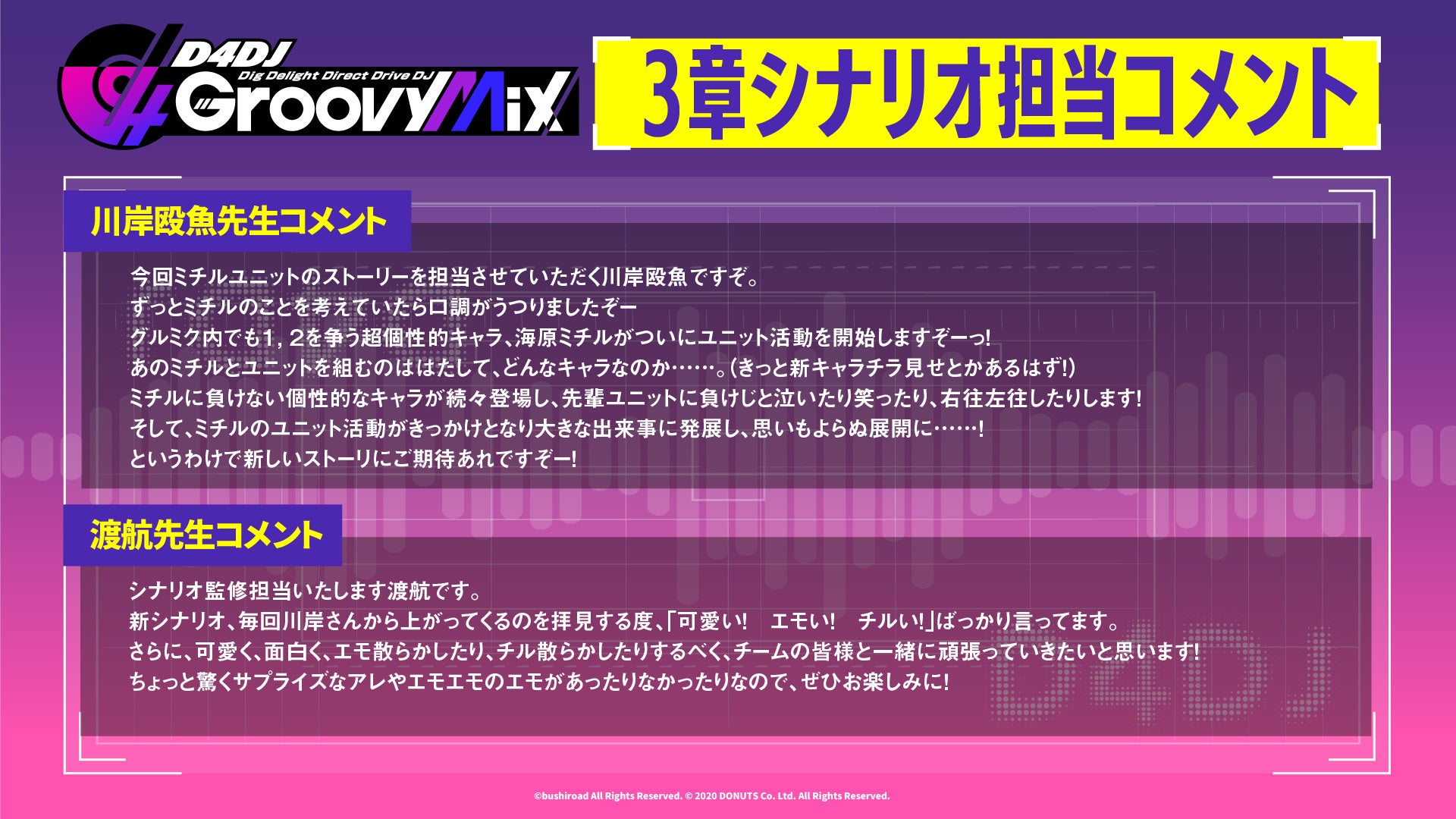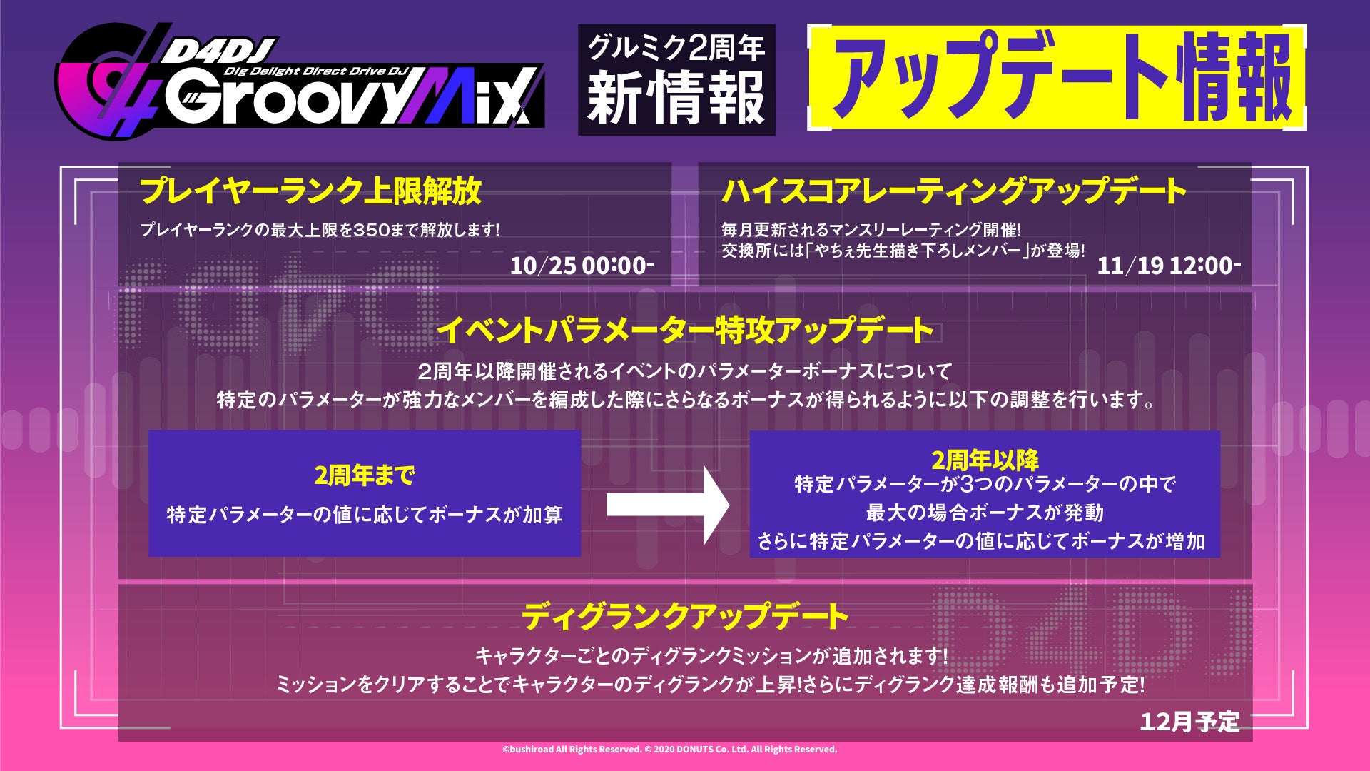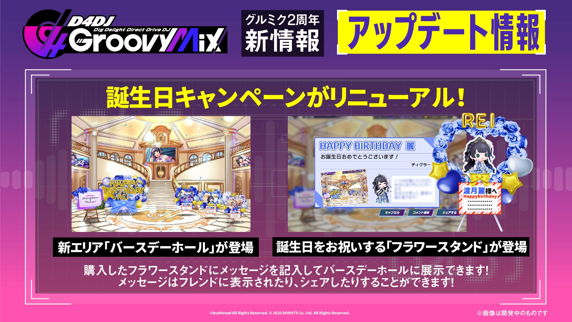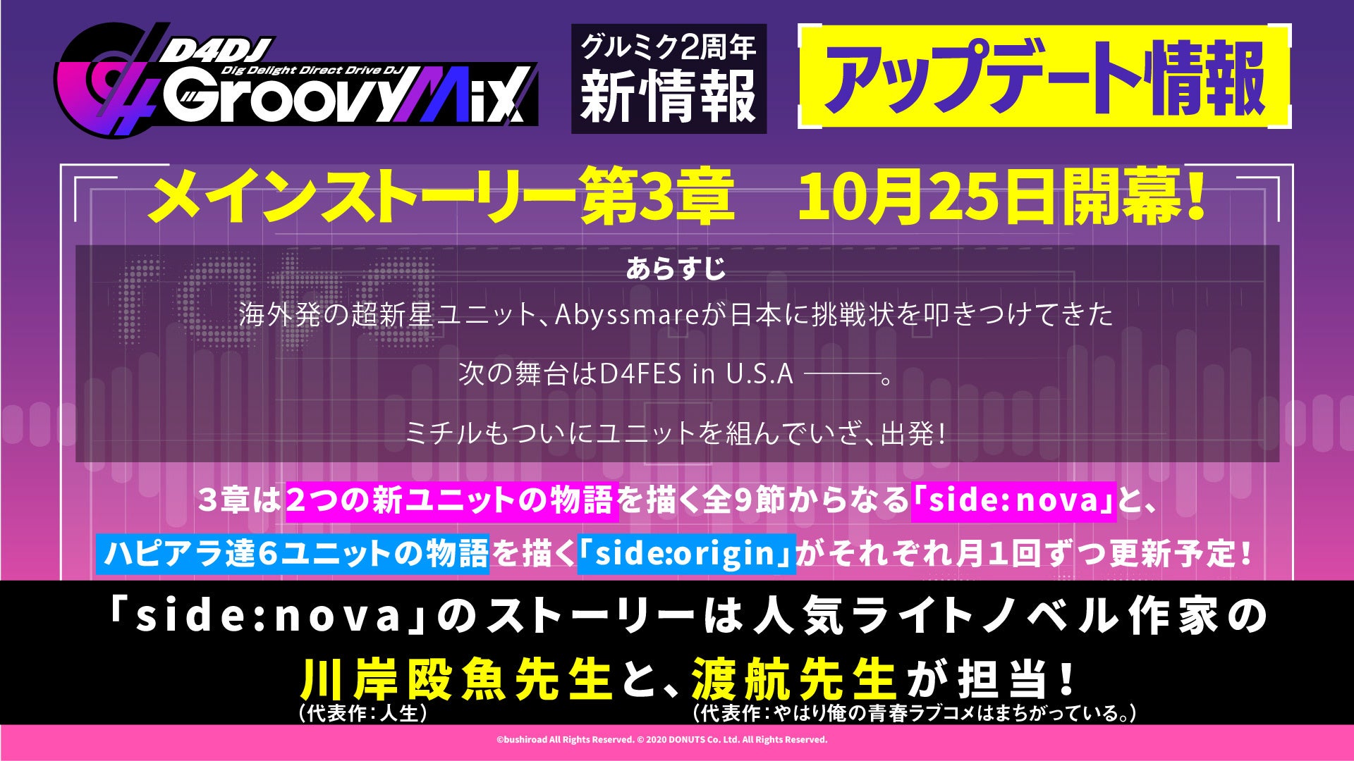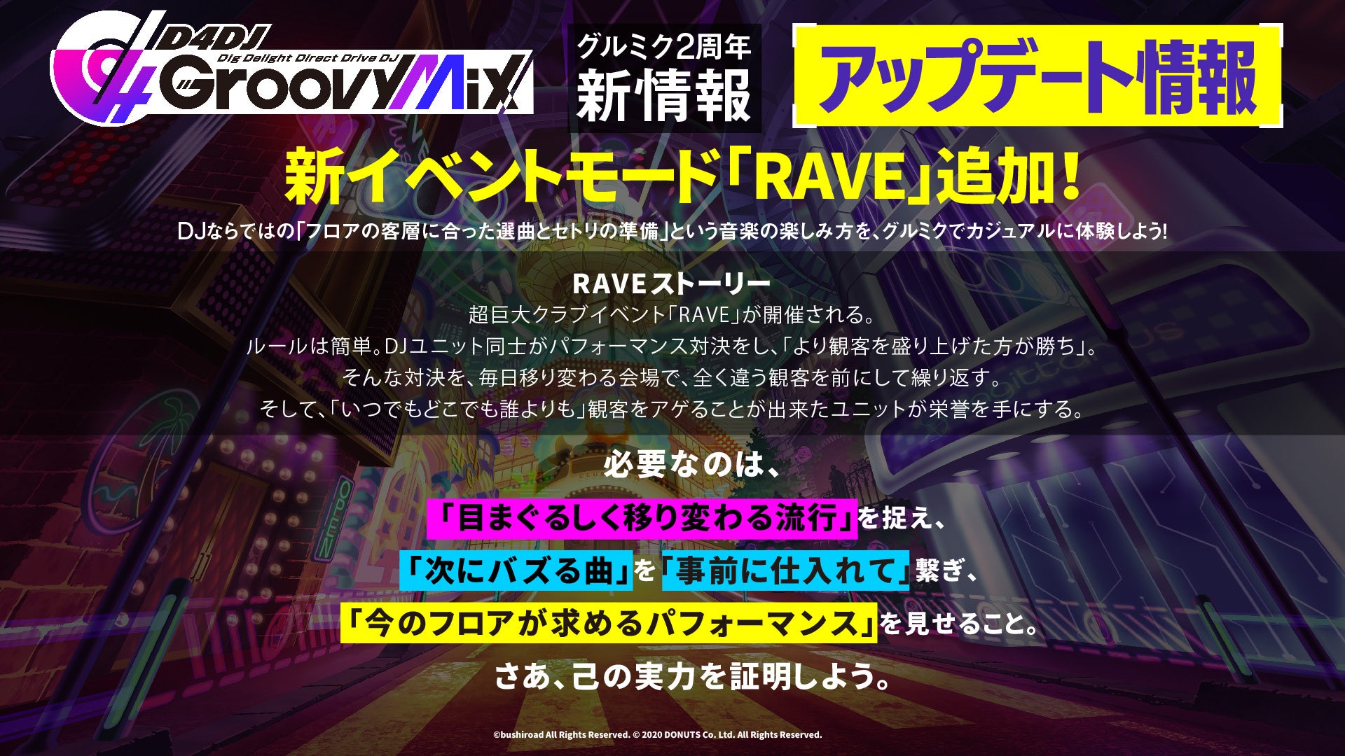 株式会社ブシロード(本社:東京都中野区、代表取締役社長:木谷高明)は、株式会社DONUTS(本社:東京都渋谷区、代表取締役:西村啓成)と共同開発のスマートフォン向けリズムゲーム「D4DJ Groovy Mix」(以下グルミク)の2周年を記念して「グルミク2周年記念生放送」を実施し、新衣装カードの実装や新ユニット「Abyssmare」の登場など各種アップデートの情報を解禁いたしました。
