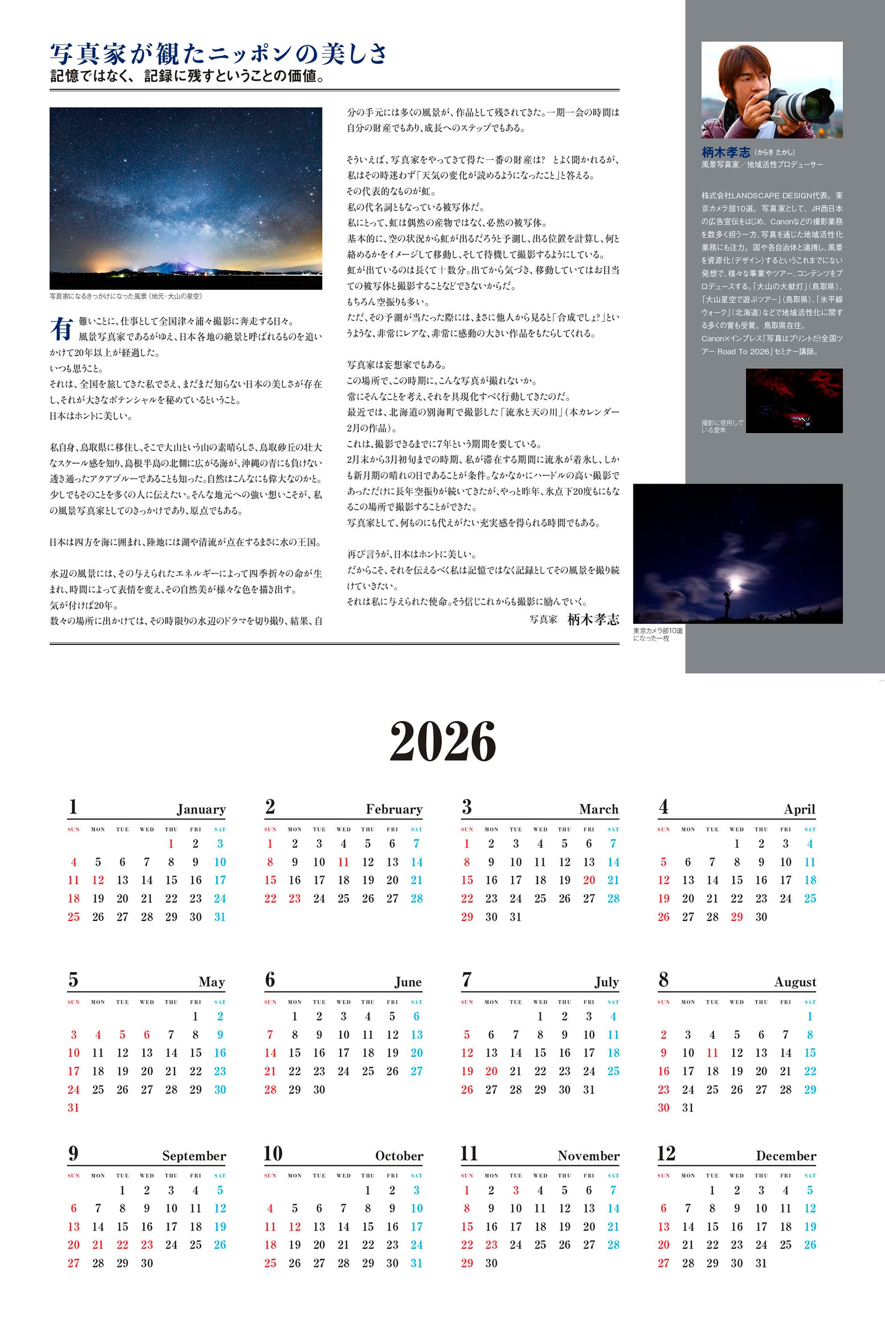 東京カメラ部10選に選ばれた人気写真家、柄木孝志さんが日本全国で撮影された水辺の絶景作品で構成されたカレンダーです。表紙写真の「ダイヤモンド大山」のように、虹や毛嵐といった水辺で見られる稀な自然条件を捉えた絶景が複数収録されています。日常に彩を添えてくれる美しい写真作品のカレンダーを、部屋に飾ってみてはいかがでしょうか。