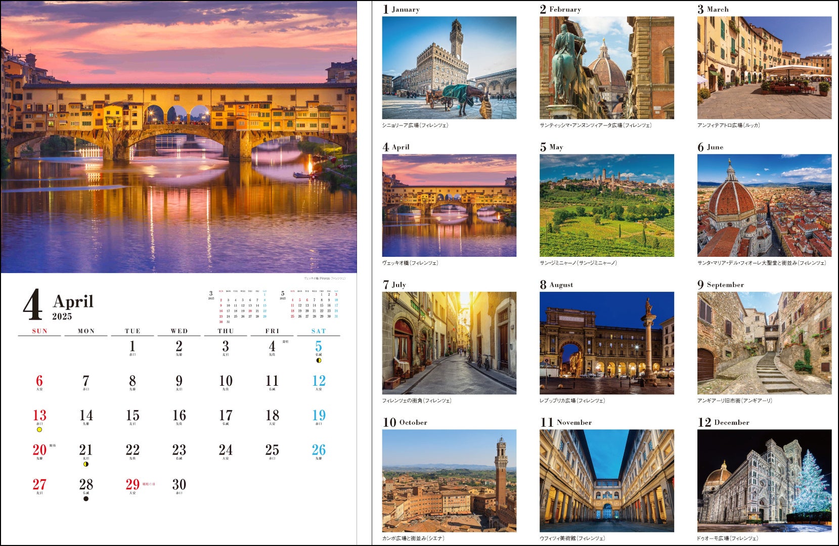 1月 シニョリーア広場/2月 サンティッシマ・アンヌンツィアータ広場/3月 アンフィテアトロ広場(ルッカ)/4月 ヴェッキオ橋/5月 サン・ジミニャーノ(サン・ジミニャーノ)/6月 サンタ・マリア・デル・フィオーレ大聖堂と街並み/7月 フィレンツェの街角/8月 レプッブリカ広場/9月 アンギアーリ旧市街(アンギアーリ)/10月 カンポ広場と街並み(シエナ)/11月 ウフィツィ美術館/12月 ドゥオーモ広場