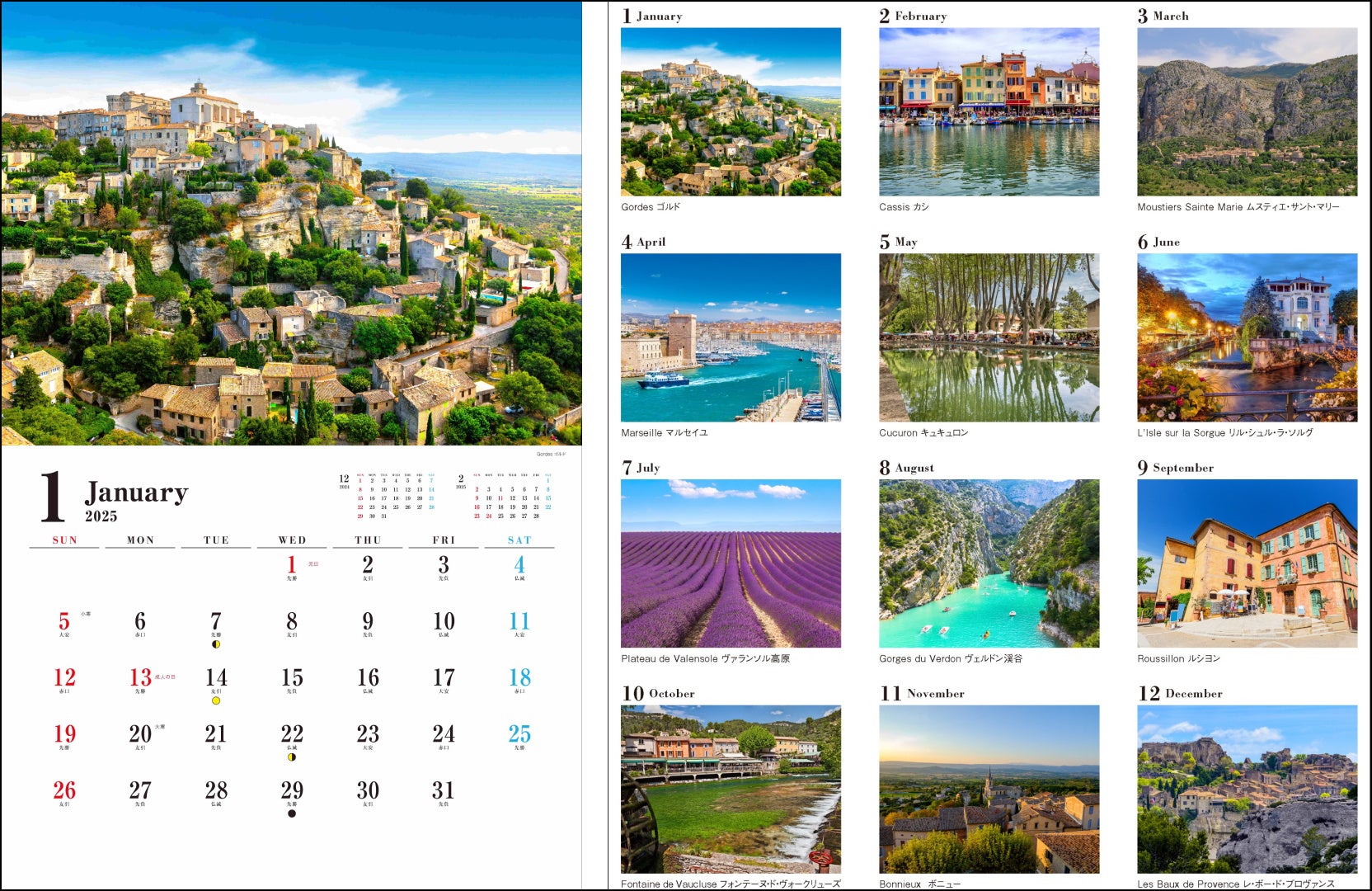 1月 ゴルド/2月 カシ/3月ムスティエ・サント・マリー/4月マルセイユ/5月キュキュロン/6月リル・シュル・ラ・ソルグ/7月ヴァランソル高原/8月ヴェルドン渓谷/9月ルシヨン/10月フォンテーヌ・ド・ヴォークリューズ/11月ボニュー/12月レ・ボー・ド・プロヴァンス