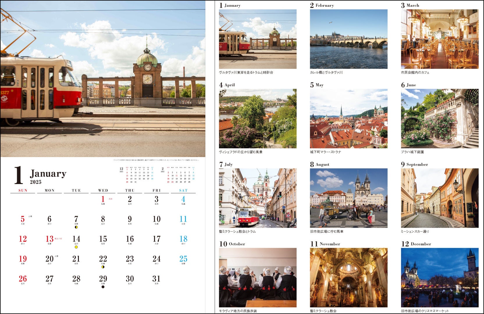 1月ヴルタヴァ川東岸を走るトラムと時計台/2月 カレル橋とヴルタヴァ川/3月 市民会館内のカフェ/4月 ヴィシェフラドの丘から望む風景/5月 城下町マラー・ストラナ/6月プラハ城下庭園/7月 聖ミクラーシュ教会とトラム/8月 旧市街広場に佇む馬車/9月 ミーシェンスカー通り/10月 モラヴィア地方の民族衣装/11月聖ミクラーシュ教会/12月 旧市街広場のクリスマスマーケット