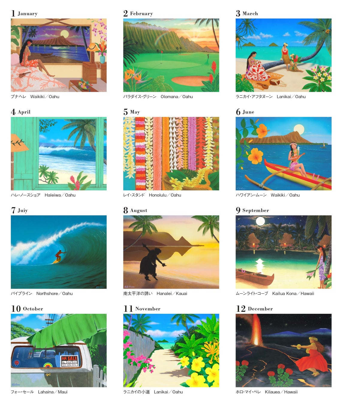 そんなHILO KUME氏の作品の中から12点を厳選。オアフ島、ハワイ島、マウイ島、カウアイ島……ハワイ好きならぐっとくるハワイ各地の風景を、一年を通して楽しめるカレンダーです。