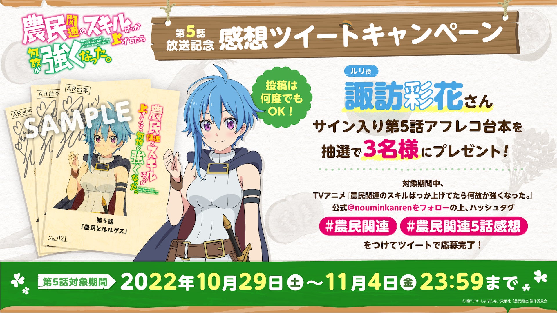 - TVアニメ『農民関連のスキルばっか上げてたら何故か強くなった。』 第5話放送記念 感想ツイートキャンペーン