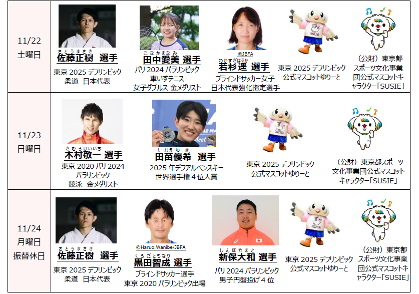 現役アスリートや東京2025デフリンピック公式マスコットゆりーと等が、ステージでのトークショーやデモンストレーション、スポーツ体験コーナーでの参加者との交流、グリーティングなどに出演します。