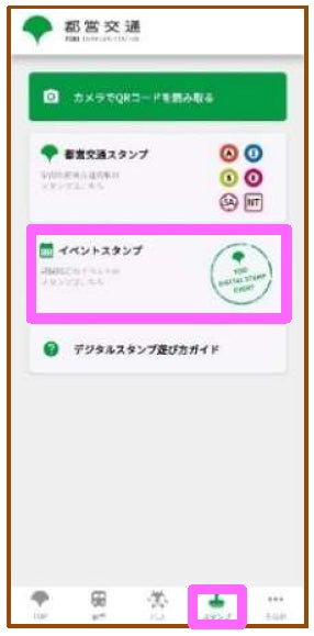 ④獲得したスタンプはイベントスタンプタブより、「都営大江戸線全線開業25周年記念 スタンプラリー」を