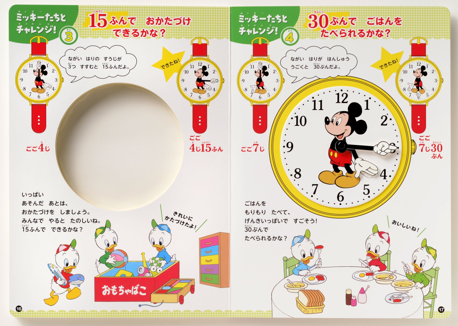 後半の「ミッキーたちとチャレンジ!」のページでは、「5ふん」「10ぷん」など「分」の概念にも触れられます。「5ふんで てを あらえるかな?」「15ふんで おかたづけ できるかな?」など、実生活にリンクした内容です。ゲーム感覚で参加できて、時間を意識しながら身支度したくなる工夫が満載です。