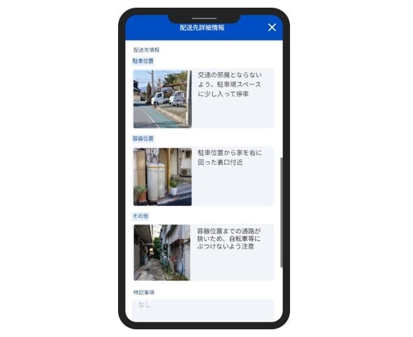 また、配送先情報の確認もできるようになりました。LPガスボンベの設置位置や配送トラックの駐車位置など文字だけでは伝わりづらい情報を配送先で確認することができます。これにより、配送員は初めて行く配送先でも作業をすることができるので、配送業務の属人化解消に貢献します。