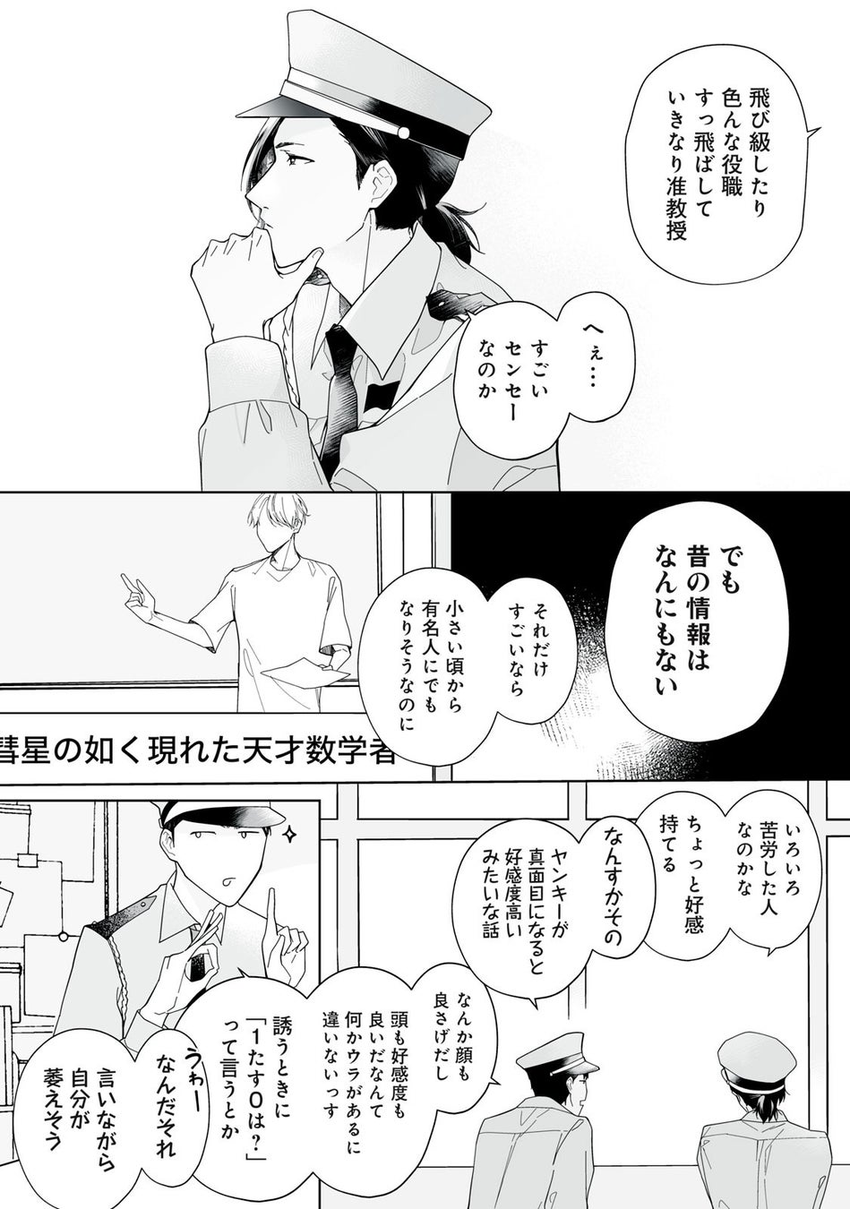 ある事件をきっかけに警察官を辞め、今は大学の警備員として穏やかな日々を過ごす松岡。ある日、構内で不審者を確保したという通報を受け駆けつけた先にいたのは、新しく赴任してきた変人数学教授・青柳だった。