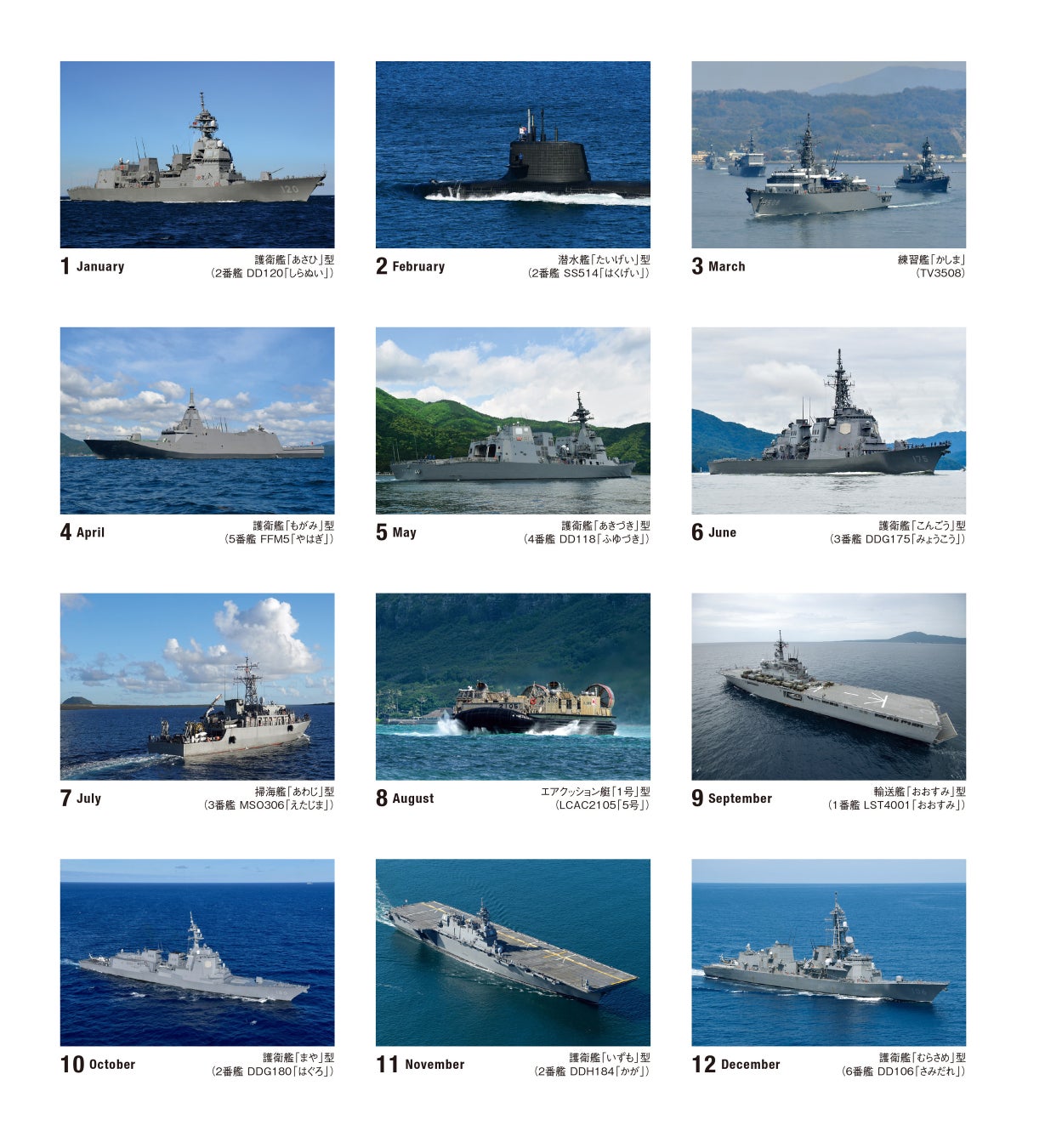 護衛艦、潜水艦、掃海艦、輸送艦、練習艦――。海上自衛隊の誇るさまざまな自衛艦の艦影を集めた2025年カレンダーです。独自撮影による空撮など、他では見られない迫力ある写真をJShips編集部が厳選。各艦艇の魅力を最大限引き出す傑作カットで一年を構成しました。また、各月に掲載された同一縮尺のイラストで各艦の装備が一目で分かり、特徴についての解説も付しています。