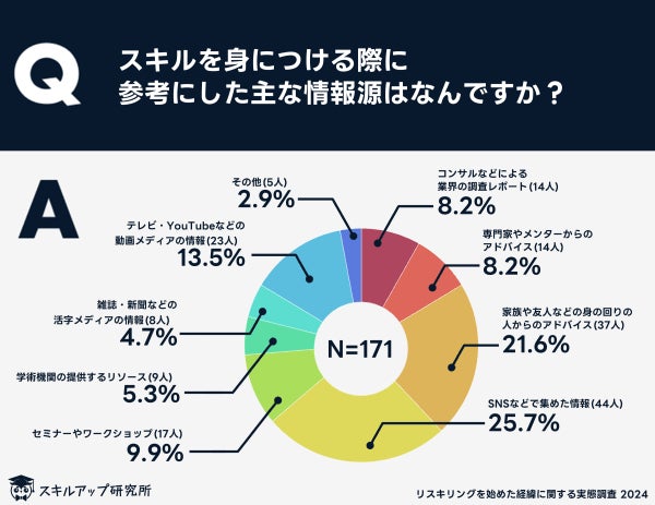 リスキリングに取り組んだ人に対して「スキルを身につける際に参考にした情報源」を尋ねたところ、最も多くの割合を集めたのは「SNSなどで集めた情報」(25.7%)となった。次いで「家族や友人などの身の回りの人からのアドバイス」(21.6%)となった。