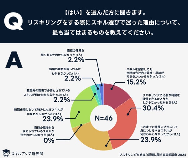 リスキリングした人にスキル選びで迷ったかどうかを尋ね、「はい」と回答した人にその理由を尋ねたところ、最も多かったのは「リスキリングに必要な時間を確保できるかどうかわからなかった」で全体の30.4%を占めた。次いで、「これまでの経歴にプラスして身につけるべきスキルが何かわからなかった」と「転職市場において強みとなるスキルが何かわからなかった」が、ともに23.9%となった。
