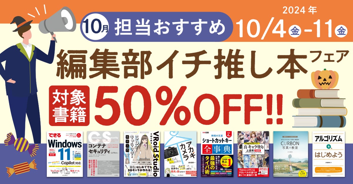 「この本をぜひ読んでほしい!」そんな編集者の熱い気持ちをお届けする、お得な電子書籍セール「担当おすすめ!編集部イチ推し本フェア」。インプレスブックスで販売している電子書籍を対象として50%オフで販売いたします。IT、デザイン、ビジネス、写真撮影など、幅広いジャンルから毎月、編集者の「今だからこそおすすめしたい良書」をご紹介していきます。おすすめポイントをまとめた編集者のコメントも掲載しておりますので、ぜひ購入の参考にしてください。