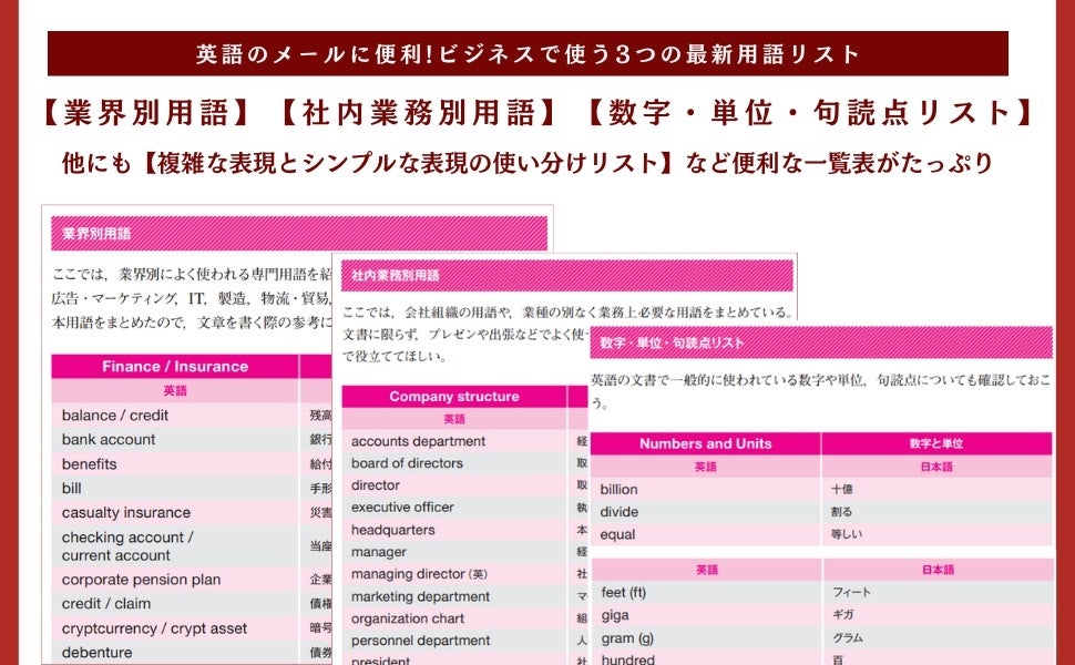 さらに英語のメールに便利な、ビジネスで使う3つの最新用語リスト【業界別用語】【社内業務別用語】【数字・単位・句読点リスト】を掲載しました。