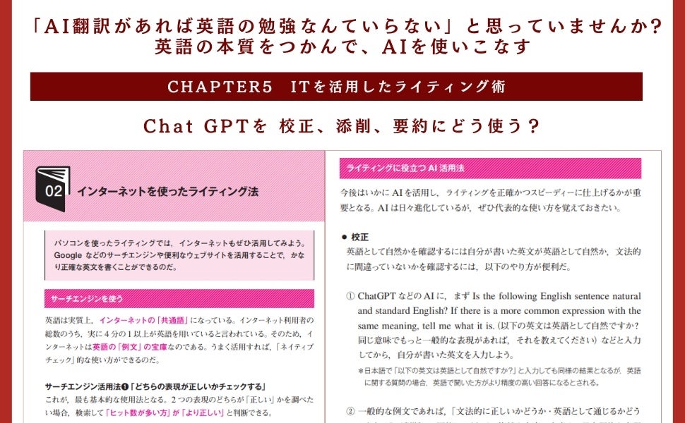 今回の改訂では、AI時代、多様な社会に対応する英語表現の書き方を改訂増補。Chat GPTを使ったライティング術など、現代のツールを効率よく使う方法も学ぶことができます。