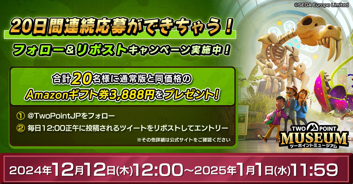 12月12日(木)12:00より、ツーポイントシリーズ公式Xアカウントの開設を記念して、12月12日(木)12:00より、20日間連続応募ができるフォロー&リポストキャンペーンを実施中です。本キャンペーンでは、合計20名様に通常版と同価格のAmazonギフト券3,888円があたるチャンスをご用意しております。ぜひこの機会をお見逃しなく!