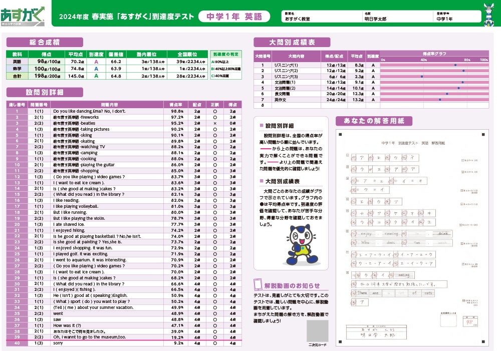 小学生の国語・算数、中学生の英語・数学の基礎的な知識・技能を測定する「到達度テスト」。お子さまの「学びの理解度確認」に加えて、「やる気・やり方」を革新的に変えます!