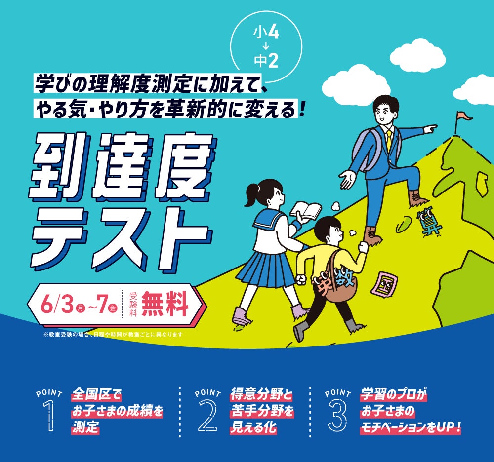 株式会社 学研ホールディングス(東京・品川/代表取締役社長:宮原博昭)のグループ会社、株式会社創造学園(神戸市/代表取締役社長:中島竜也)では、6月3日(月)~7日(金)に、小4~中2対象の「到達度テスト」を実施いたします。