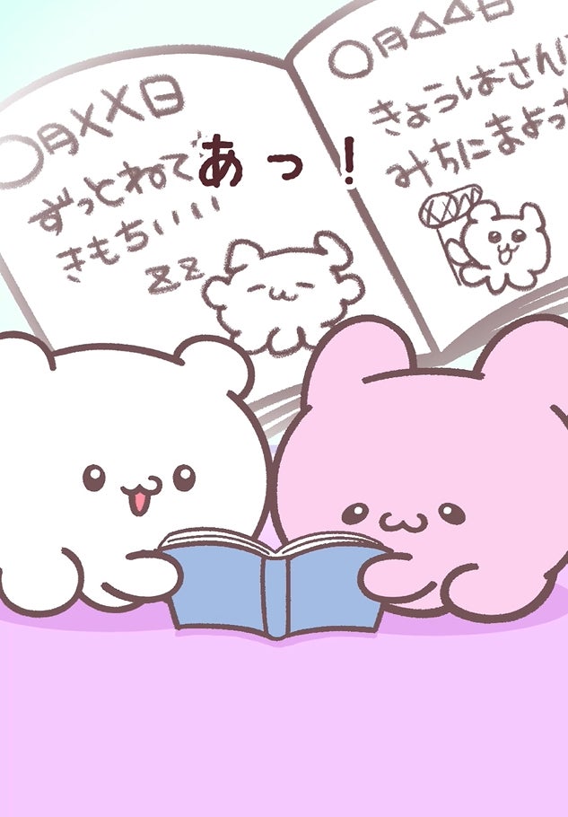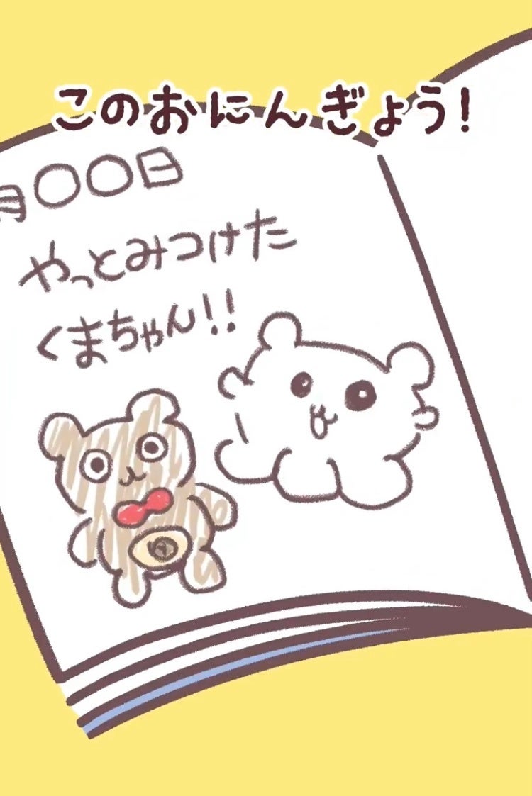 すもっぴの日記をめくる、すもっぴとぴょんちー。であった日の日記には、「やっとみつけた くまちゃん!!」の文字。