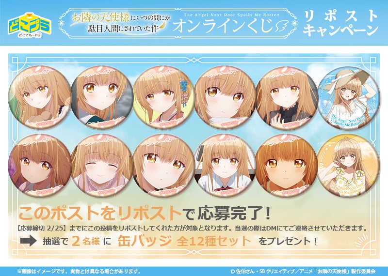 「どこプラ」公式Xアカウントでは、「『お隣の天使様にいつの間にか駄目人間にされていた件』オンラインくじ」発売を記念して、抽選で2名様に缶バッジ全12種セットが当たる、プレゼントキャンペーンを実施中です。「どこプラ」公式Xから発信した対象の投稿をリポストしていただくことでご応募いただけます。