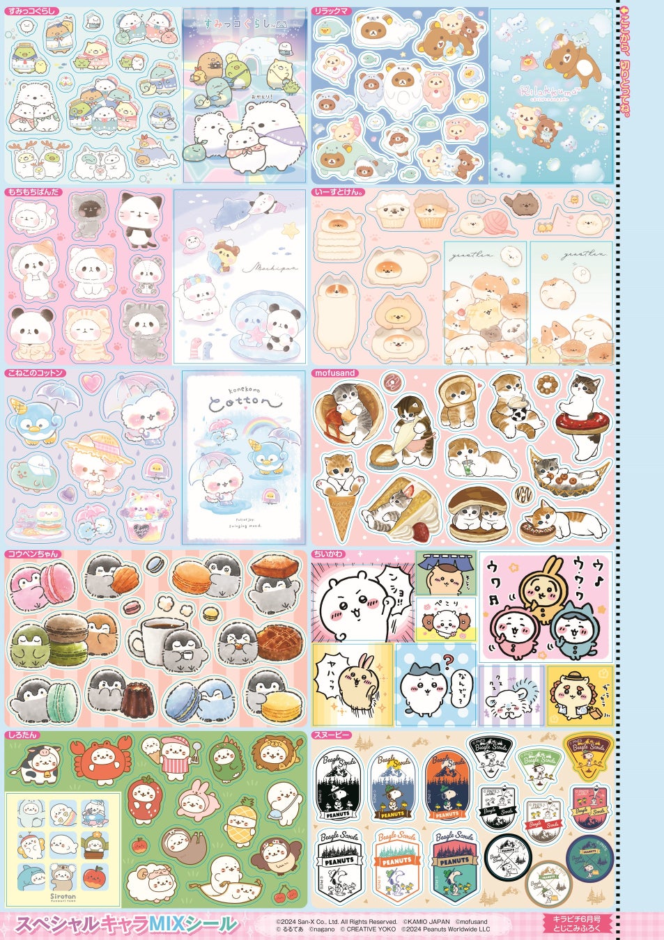 今号のキャラMIXシールは、「すみっコぐらし」「リラックマ」「もちもちぱんだ」「いーすとけん。」「こねこのコットン」「mofusand」「コウペンちゃん」「ちいかわ」「しろたん」「スヌーピー」の全10キャラクター! ぜんぶキュートで、どれから使おうかまよっちゃうね♥