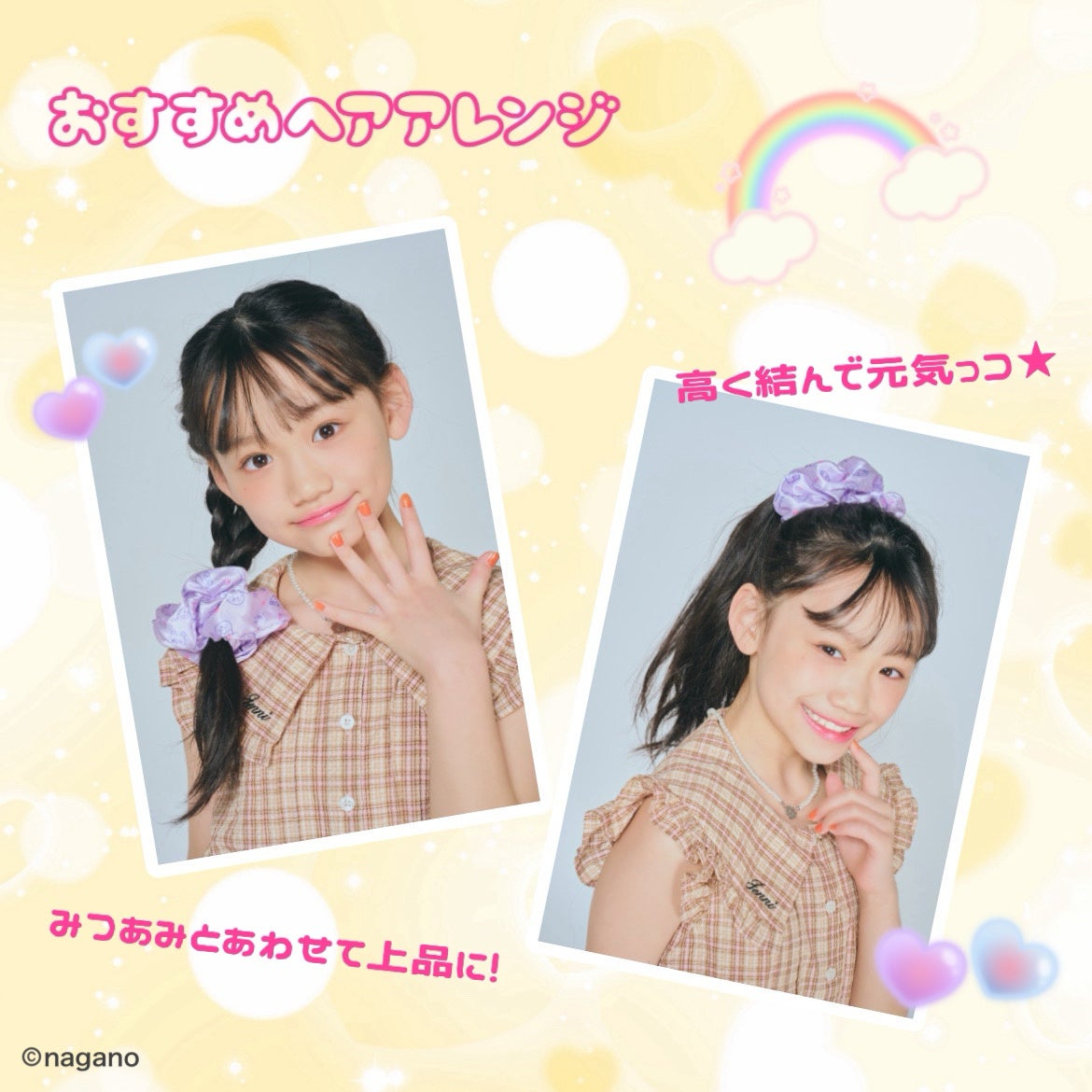 「シュシュ」は、散りばめられたちいかわたちがとってもキュート! 存在感バツグンな大きめサイズのシュシュだよ★ 高級感のあるパープルのサテン生地がポイント!