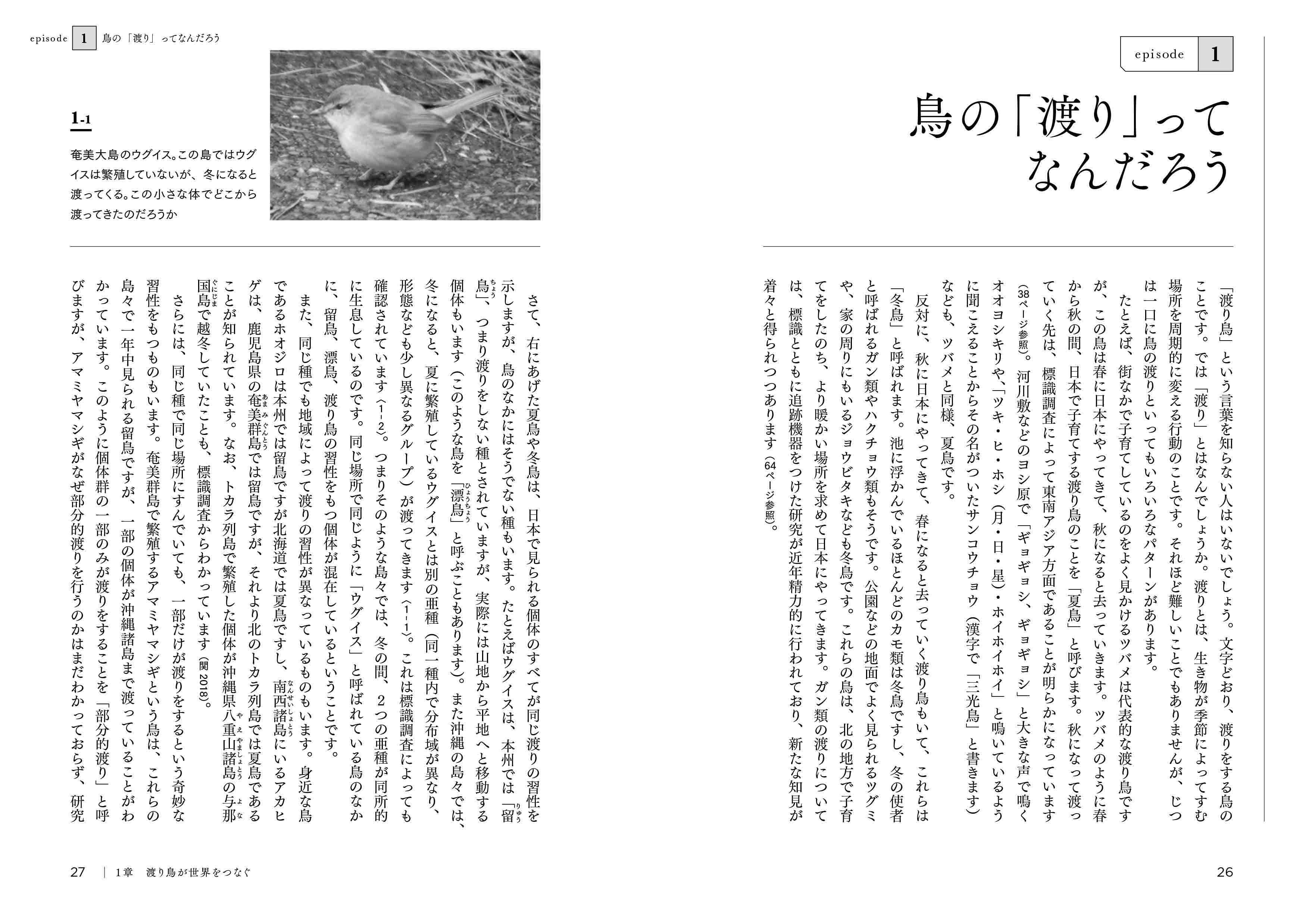 鳥の渡りってなんだろう/鳥の長距離移動チャンピオン/東京と福岡のユリカモメがどこか違う/ツバメの越冬地を求めて/ベニアジサシの越冬地の発見/アジサシ類は天気を呼んで渡る?/先端技術と標識調査/日本にいるハマシギは、どこからやって来るのか/足環で判明したツル類の生態/渡り鳥がつなぐ国際協力の輪