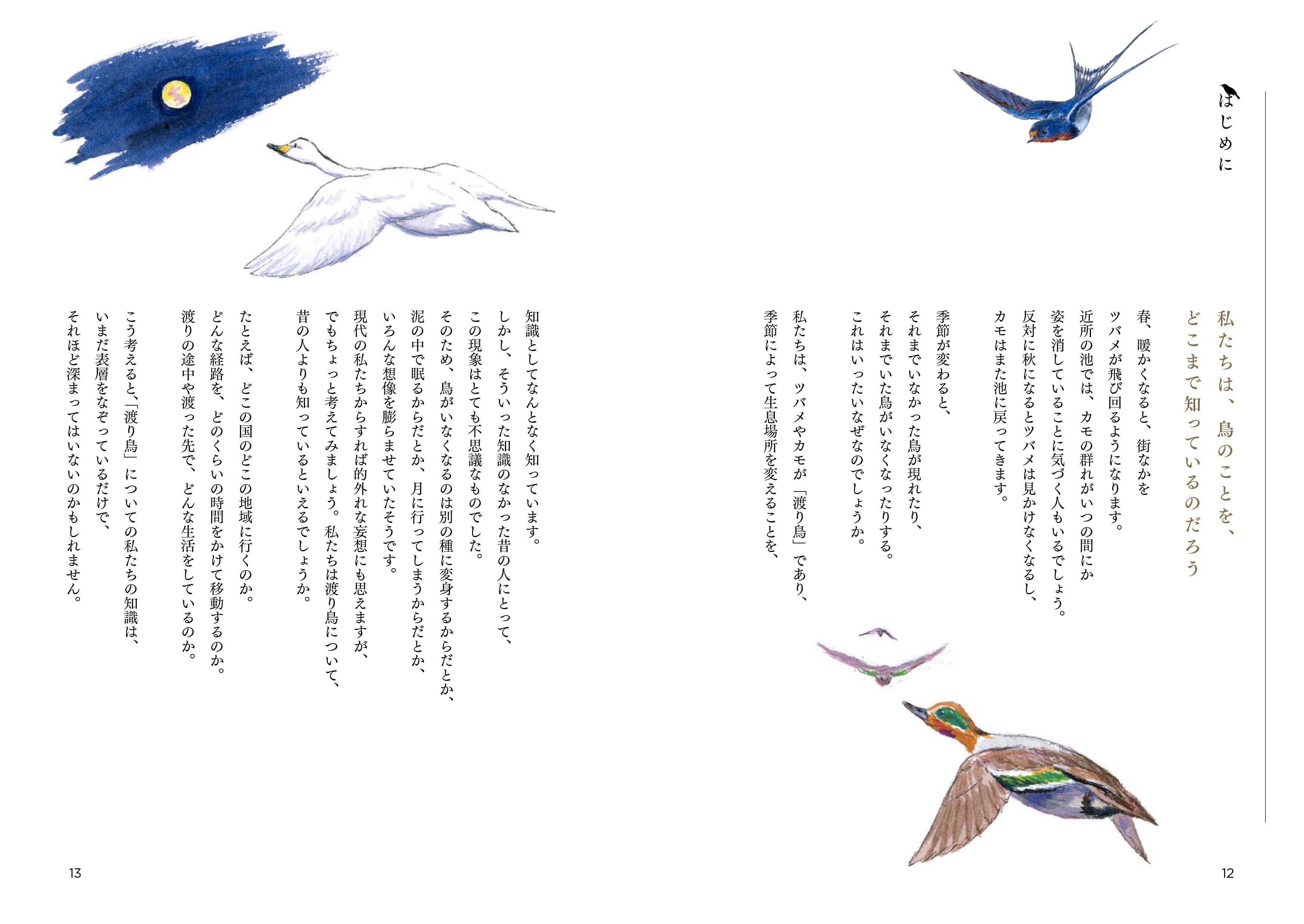「はじめに ~私たちは、鳥のことを、どこまで知っているのだろう~」では、絵本作家・鈴木まもるさんの描き下ろしイラストとともに、鳥類標識調査とは何か、どんなふうにして鳥に標識をつけるかなどを、カラーページで解説しています。