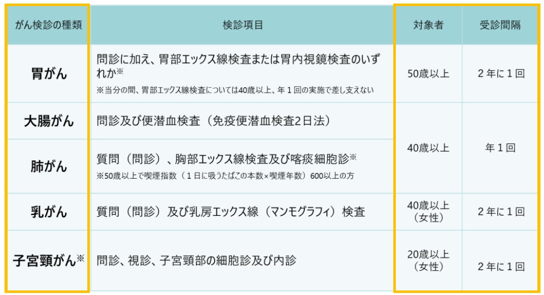 がんによる死亡率の減少効果が科学的に証明されているがん検診として、国は以下の5つのがん検診について、検診項目、対象者、受診間隔等を指針で定めて受診を推奨しています。