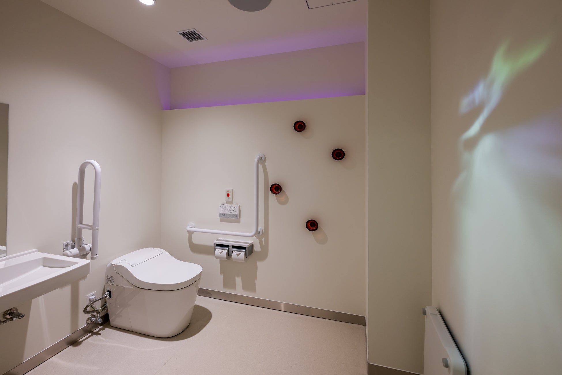 1階のトイレについては、パナソニック エレクトリックワークス社の社内施設としては初めて、オールジェンダートイレとしました(名称:みんなのトイレ)。食堂からの視線を配慮し、食堂とトイレの中間部分に洗面ホールを設け、シンボリックな洗面カウンターを配置。人々の心に安定感や平和をもたらすと言われる円形や曲線を取り入れ、性別にとらわれることなく誰もが気兼ねなく利用しやすい雰囲気を光や映像で演出しています。トイレ機能だけでなく、気分転換できる場として使用できる空間を実現しました。