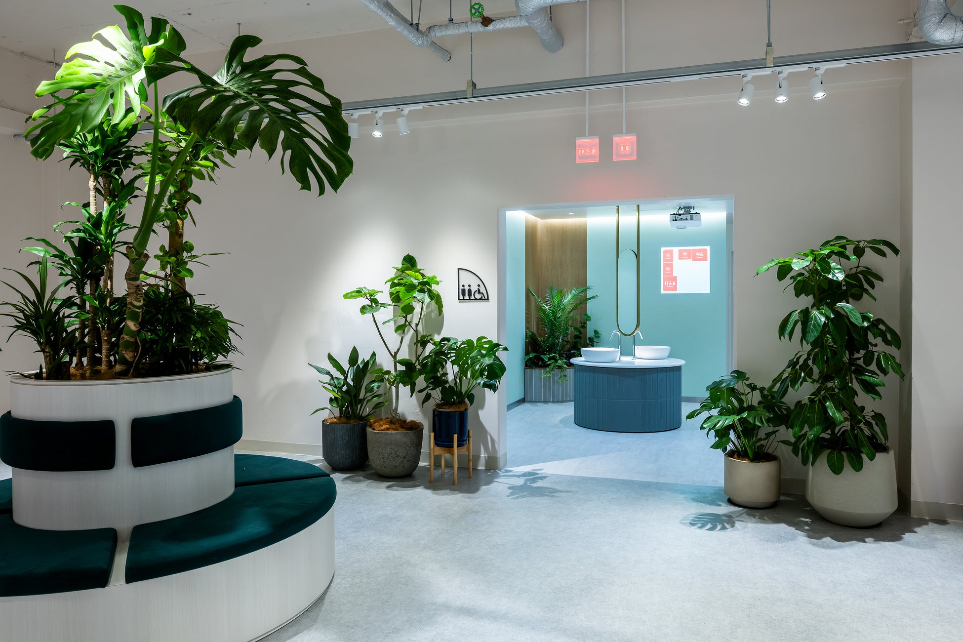 また2階の一角には、「自分を発掘できる公園」をコンセプトとした交流スペース「リトリートマルシェ」を開設。社員が自由にイベントを開催でき、従業員同士のコミュニケーションを促します。映像・照明・音・香りが連動する空間演出システムで、ワークスペースやリフレッシュの場所としても活用が可能です。