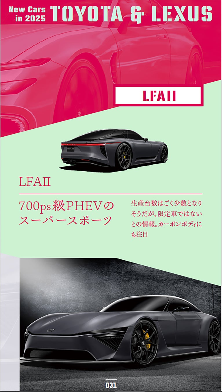 続いて「MR2」のスクープ企画。MR2といえば、「これが純エンジンを搭載するトヨタ最後のスポーツカーになる」と関係者が語る、かつて人気だったトヨタのミドシップスポーツカーだが、この名車が復活するというスクープ。こちらもエンジンやシャシーなど、ベストカーしか知り得ない情報をお届けする。ベストカーならではのリアルで美麗なCGで、市販モデルへの想像をおおいに膨らませてもらいたい。