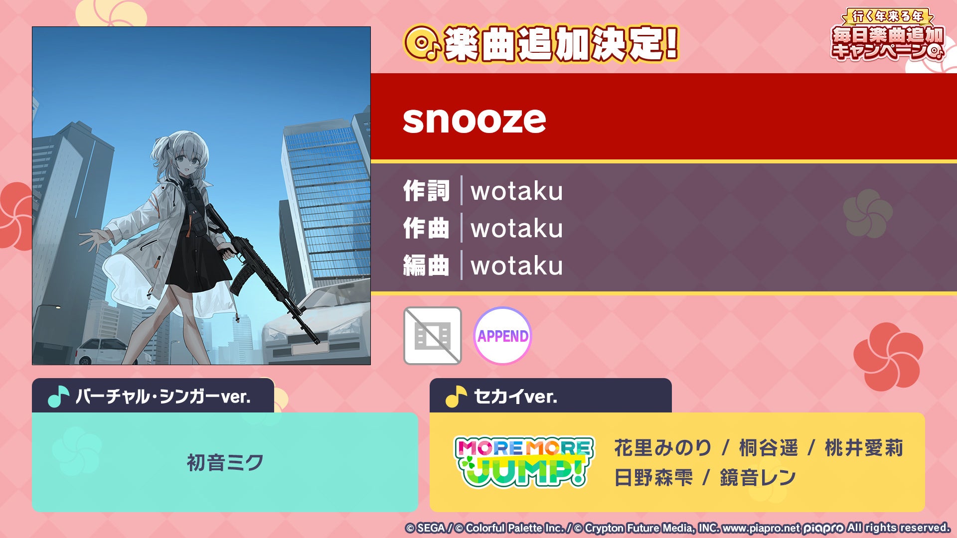 また、「酔いどれ知らず」(作詞・作曲:Kanaria)に、東雲彰人(CV.今井文也)、青柳冬弥(CV.伊東健人)が歌唱する2種類のアナザーボーカルver.を、「キュートなカノジョ」(作詞・作曲:syudou)に、東雲絵名(CV.鈴木みのり)が歌唱するアナザーボーカルver.を追加いたしました。
