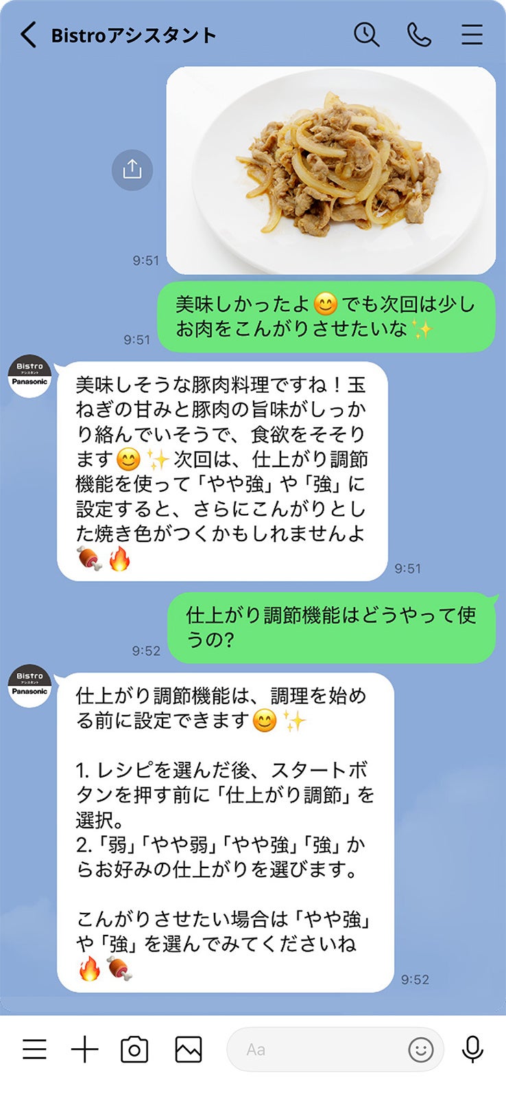 Bistroアシスタントは、LINE公式アカウント(※2)を活用した新たな食体験をお届けする月額サービスです。BistroアシスタントのLINE公式アカウント上でチャットすると、生成AIが即座に認識し、お客様の好みやライフスタイルに応じた最適なレシピ提案や調理中の疑問にリアルタイムで応対します。まるでプロの料理家が隣で見守ってくれているように、料理が完成するまでのプロセスに存在するさまざまな悩みやお困りごとをサポートするほか、次回以降の調理に役立つヒントや新しい料理のアイデアの提供を通じて、より豊かで彩りある食卓をお届けします。既にLINEをお使いの場合は、サービスのBistroアシスタントLINE公式アカウントへの友だち追加を行えば利用可能です(※3)。