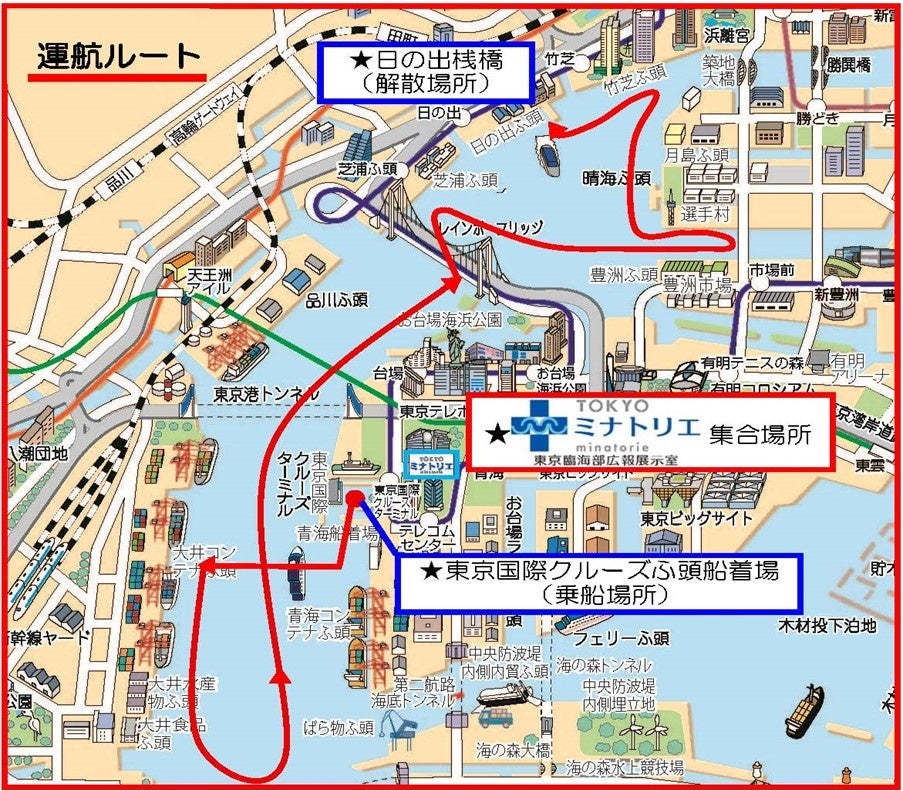 東京国際クルーズふ頭船着場 出航 大井ふ頭前面 → 青海ふ頭前面 → 品川ふ頭前面 → お台場海浜公園前面 → レインボーブリッジ → 芝浦ふ頭前面 → 晴海ふ頭・豊洲ふ頭前面 → 日の出桟橋 |