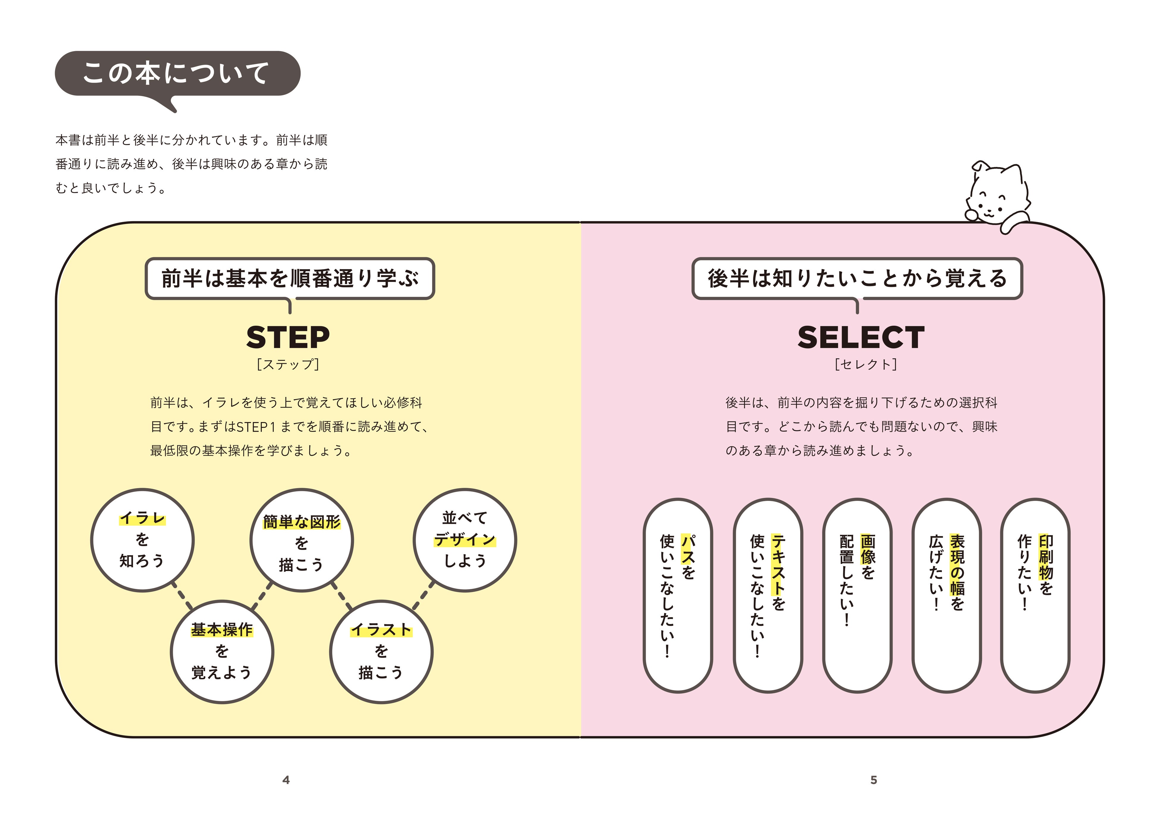 本書は、2部構成でイラレの基本をマスターすることができます。前半の「STEP」では、順番通りに読み進めることで、最低限の基本操作を中心とした基礎をしっかり身に付けられます。後半の「SELECT」では、基礎を身に付けた上で自分が知りたい知識から学べます。解説で取り上げる内容は、「イラレの仕組み」「基本操作」「必須ツール」「パスのコツ」など、初心者に必要な基本的な知識を厳選して解説しているので、効率よくイラレの知識を身に付けることができます。
