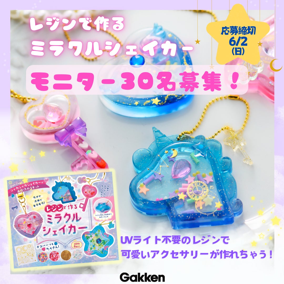 『レジンで作る ミラクルシェイカー』は、つやつやキラキラした本格的なシェイカーが作れるキット。レジンで作ったつやつやケースの中にかわいいフレークが入っている、人気のお守りアイテムです!