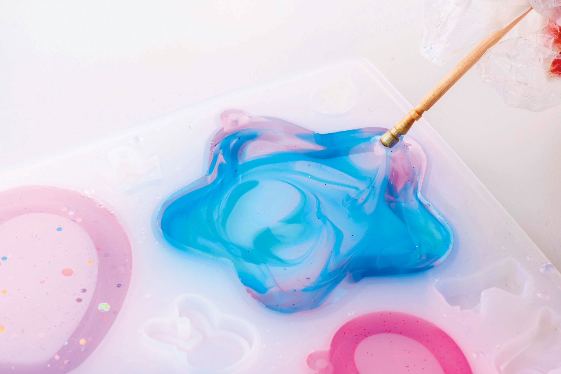 UVライト不要! まぜるだけで自然に固まるレジン液に加え、ハートやユニコーンのゆめかわなオリジナルシリコン型つきで、プロ直伝の本格的なかわいい作品を作ることができます。2色のクリスタルインクでグラデーションやマーブル模様も作れます。