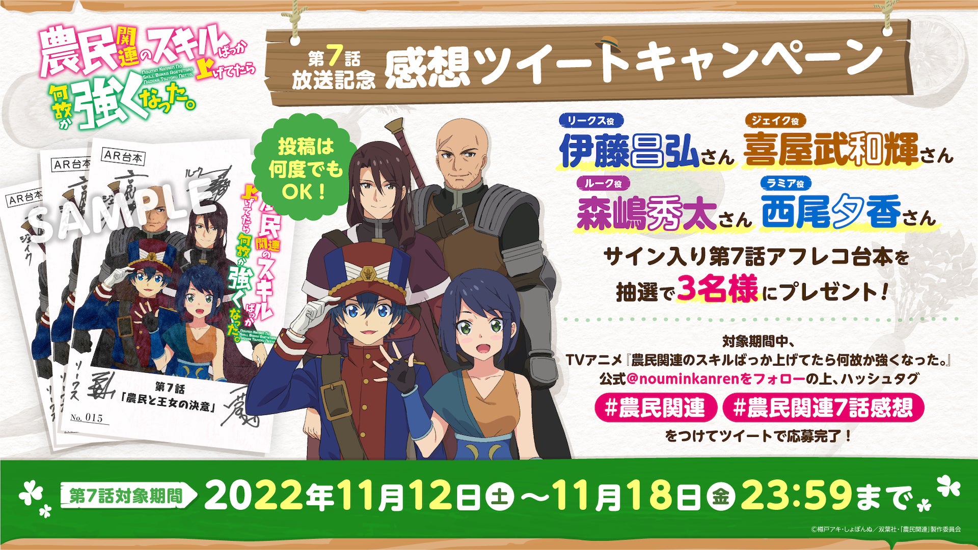- TVアニメ『農民関連のスキルばっか上げてたら何故か強くなった。』 第7話放送記念 感想ツイートキャンペーン