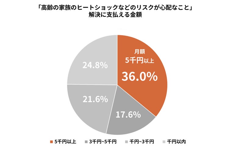 冬の室温ストレス・悩みについて、高齢の親と同居する人(N=400)に調査したところ、「高齢の家族のヒートショックなどのリスクが心配なこと」と答えた人は約4割(39.3%)であり、回答者のうち8割(79.6%)は「お金を払ってでも解決したい」と回答しました。そのうち約3人に1人(36.0%)は、悩みを解消するためであれば「月額5千円以上払える」と回答しました。