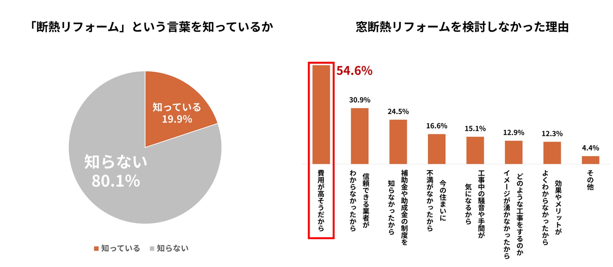 一方で、東京都が2025年7月に実施した「断熱リフォーム普及啓発における調査」では、生活者の「断熱リフォーム」の認知度は約2割(19.9%)であることが明らかになりました。また、窓断熱リフォームに関して、興味はあるが実施検討をしなかった人の理由として「費用が高そうだから」が最も多く(54.6%)、費用の認識が普及への課題となっていることが分かりました。