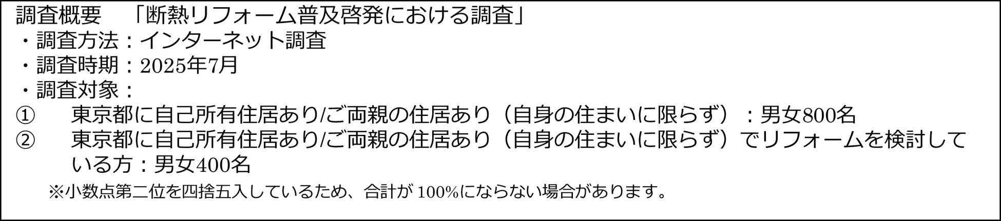 東京都は既存住宅における省エネ改修促進のため、高断熱窓・ドア等への改修に対して助成事業を展開しています。その一環として、持ち家に住む・所有する人を対象に「住まいの室温に関する実態調査」「断熱リフォーム普及啓発における調査」を実施しました。