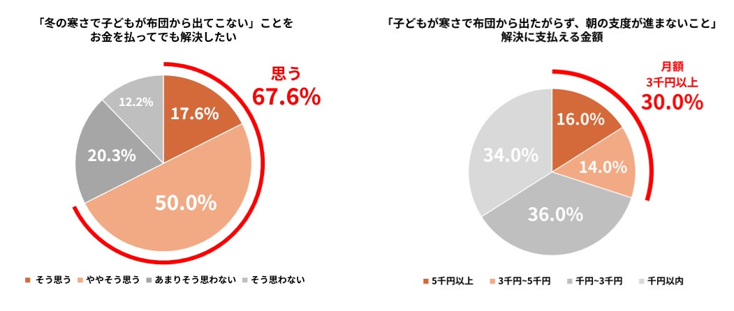 冬の室温ストレス・悩みについて、小学生以下の子どもがいる親(N=400)に調査したところ、「子どもが寒さで布団から出たがらず、朝の支度が進まないこと」に約3人に1人の親(37.1%)が悩んでいることが判明しました。また、この悩みについて「お金を払ってでも解決したい」と回答した親は約7割(67.6%)となり、回答者のうち3割(30.0%)が、「月額3千円以上払える」と回答しました。