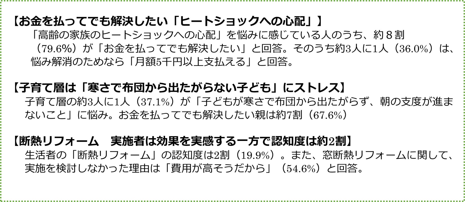 調査の結果、多くの人が高齢の家族のヒートショックなど健康への影響にストレスや悩みを抱えており、お金を払ってでも解決したいという意欲も見られる一方、冬の室温ストレス軽減につながる断熱リフォームについては認知度が低いことも明らかになりました。
